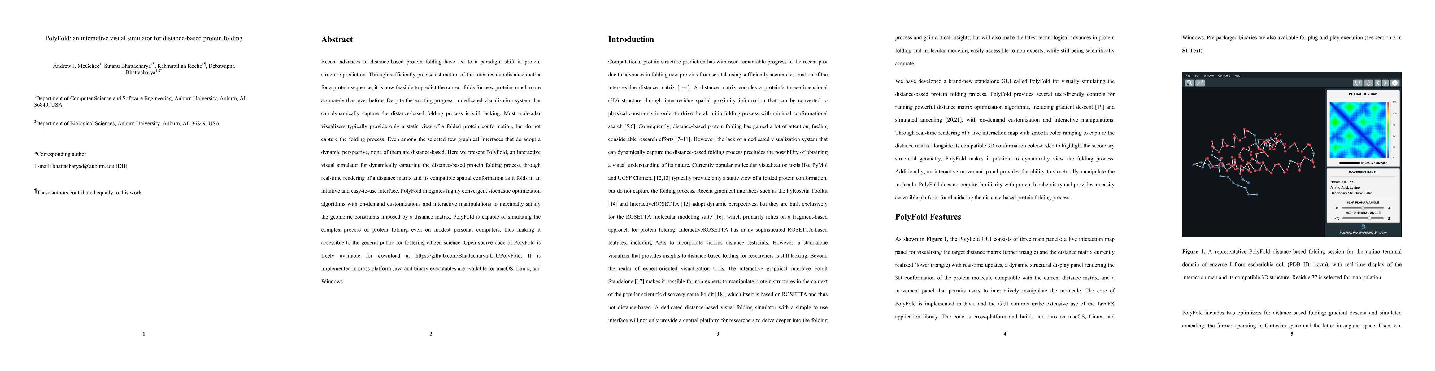 PolyFold is an interactive visual simulator that dynamically captures the distance-based protein folding process through real-time rendering. It integrates stochastic optimization algorithms and offers interactive manipulations to simulate protein folding on personal computers.