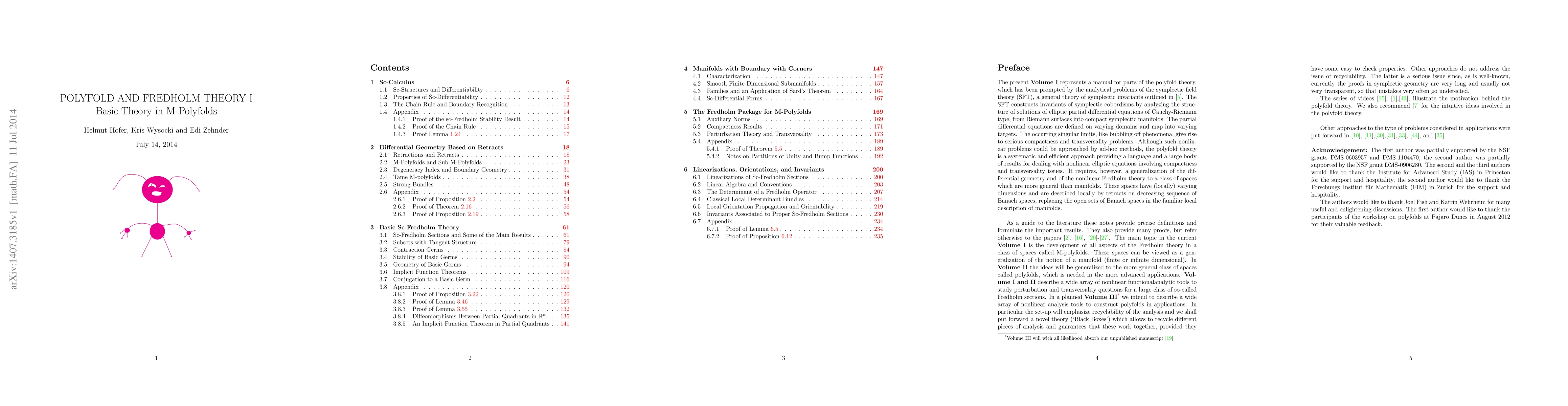 The main topic is the development of a Fredholm theory in a new class of spaces called M-polyfolds. In the subsequent Volume II the theory will be generalized to an even larger class of spaces called polyfolds, which can also incorporate local symmetries. The whole package provides a functional analytic framework to deal with compactness and transversality issues as they occur in moduli problems of symplectic geometry. Applications of the theory cover Floer-type theories as they occur in symplectic geometry. M-polyfolds and the more general polyfolds are smooth spaces which can be finite-dimensional as well as infinite-dimensional. In applications of interest they in general have locally varying dimensions. Despite the fact that the spaces are much more general than Banach manifolds a nonlinear Fredholm theory with the usual features is possible (Sard-Smale type perturbation theory). This generalized Fredholm theory can be applied to classes of nonlinear elliptic problems which show bubbling-off phenomena but allow for certain kind of compactifications.