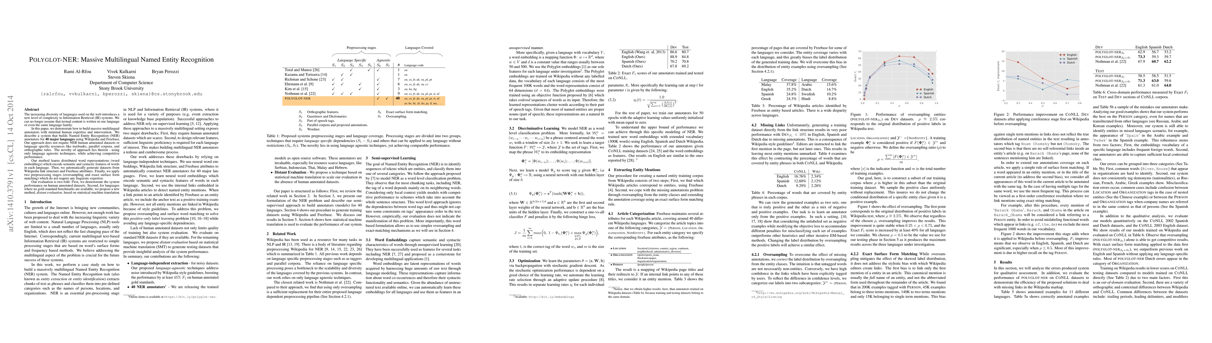 The paper describes a system for building massive multilingual Named Entity Recognition (NER) annotators using language-agnostic techniques, relying on word embeddings, Wikipedia link structures, and Freebase attributes. It employs oversampling and exact surface form matching without linguistic expertise.