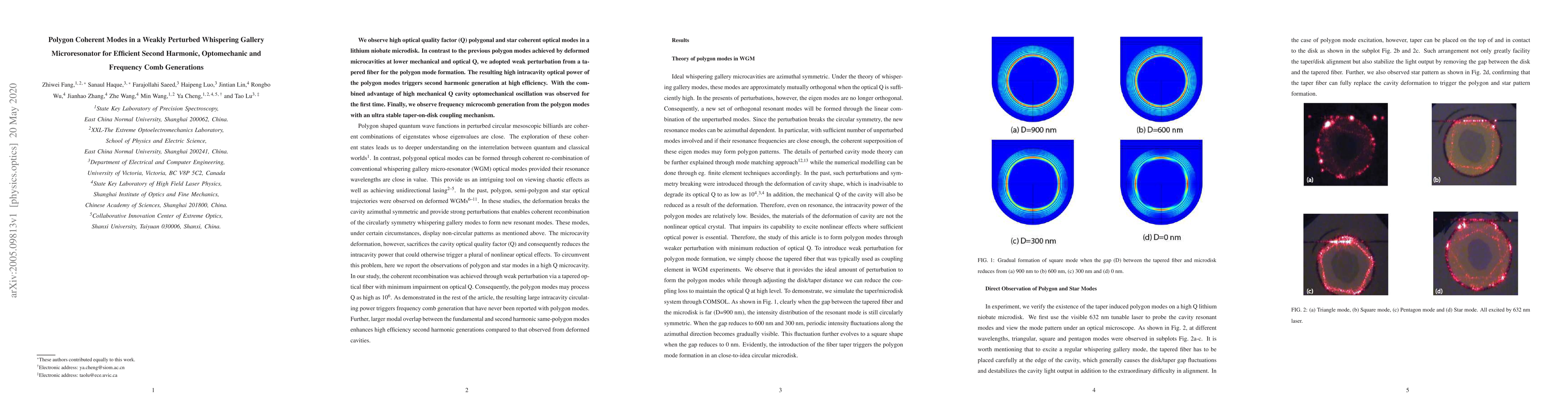 We observe high optical quality factor (Q) polygonal and star coherent optical modes in a lithium niobate microdisk. In contrast to the previous polygon modes achieved by deformed microcavities at lower mechanical and optical Q, we adopted weak perturbation from a tapered fiber for the polygon mode formation. The resulting high intracavity optical power of the polygon modes triggers second harmonic generation at high efficiency. With the combined advantage of high mechanical Q cavity optomechanical oscillation was observed for the first time. Finally, we observe frequency microcomb generation from the polygon modes with an ultra stable taper-on-disk coupling mechanism.