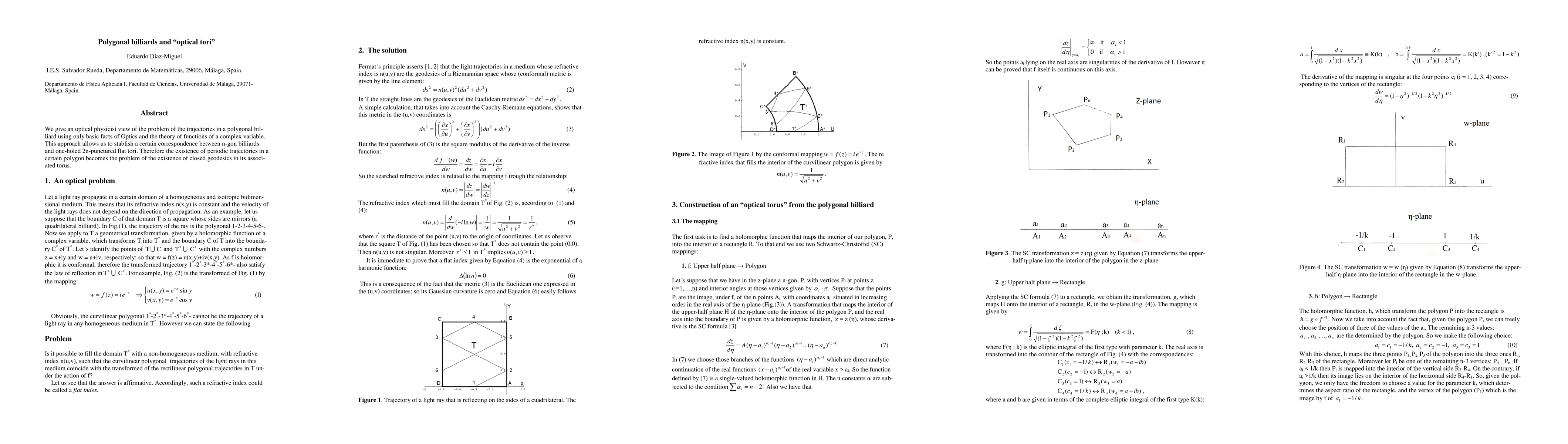 We give an optical physicist view of the problem of the trajectories in a polygonal billiard using only basic facts of Optics and the theory of functions of a complex variable. This approach allow us to stablish a certain correspondence between n-gon billiards and one-holed 2n-punctured tori. Therefore the existence of periodic trajectories in a certain polygon becomes the problem of the existence of closed geodesics in its associated torus.