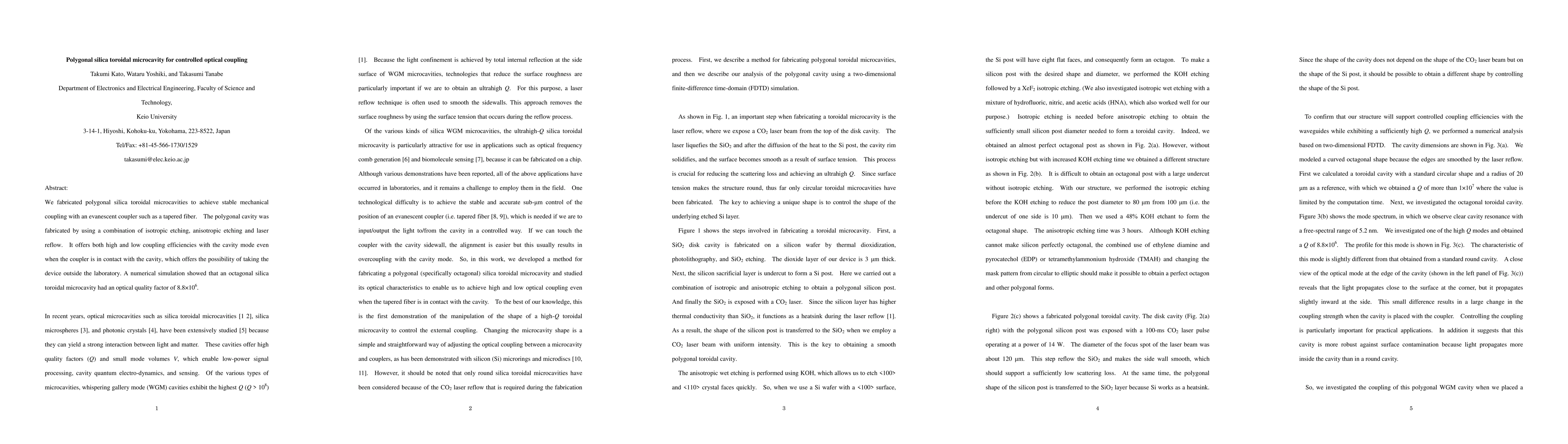 This paper describes the fabrication of polygonal silica toroidal microcavities using a combination of etching and laser reflow techniques, enabling stable mechanical coupling with evanescent couplers. The octagonal design demonstrated high optical quality factor and versatile coupling efficiency, suggesting potential for practical, non-laboratory applications.