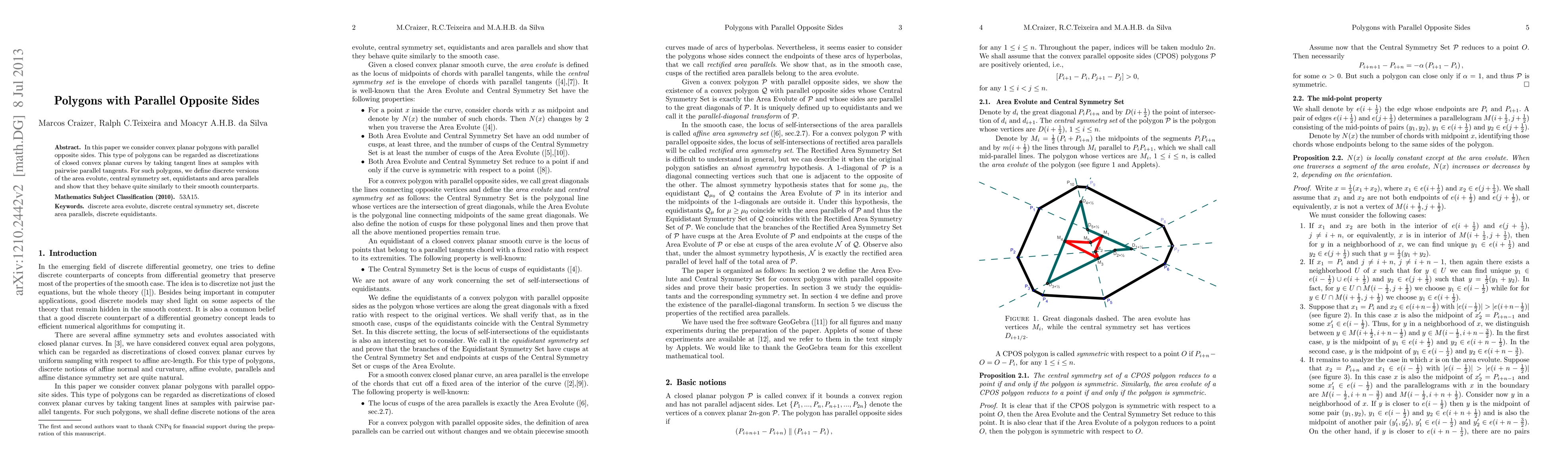 This paper explores planar polygons with parallel opposite sides, viewing them as discretized versions of closed convex curves. It defines discrete versions of the area evolute, central symmetry set, equidistants, and area parallels, demonstrating their similarity to their smooth counterparts.