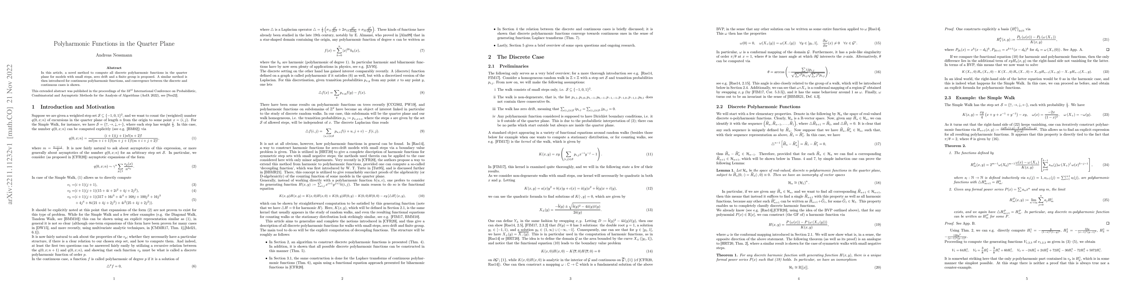 In this article, a novel method to compute all discrete polyharmonic functions in the quarter plane for models with small steps, zero drift and a finite group is proposed. A similar method is then introduced for continuous polyharmonic functions, and convergence between the discrete and continuous cases is shown.