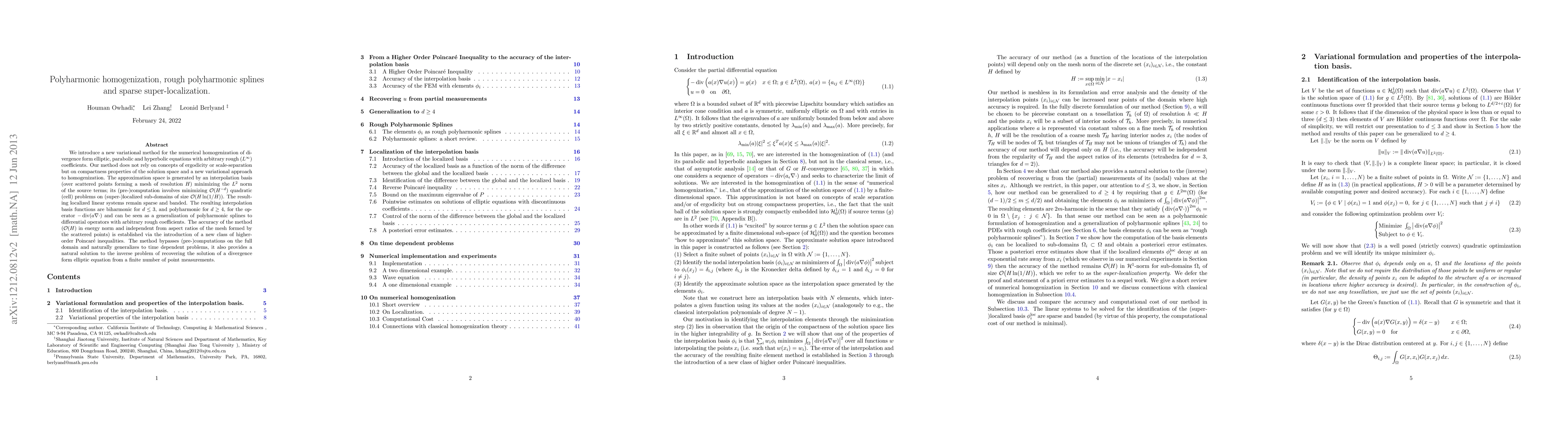 We introduce a new variational method for the numerical homogenization of divergence form elliptic, parabolic and hyperbolic equations with arbitrary rough ($L^\infty$) coefficients. Our method does not rely on concepts of ergodicity or scale-separation but on compactness properties of the solution space and a new variational approach to homogenization. The approximation space is generated by an interpolation basis (over scattered points forming a mesh of resolution $H$) minimizing the $L^2$ norm of the source terms; its (pre-)computation involves minimizing $\mathcal{O}(H^{-d})$ quadratic (cell) problems on (super-)localized sub-domains of size $\mathcal{O}(H \ln (1/ H))$. The resulting localized linear systems remain sparse and banded. The resulting interpolation basis functions are biharmonic for $d\leq 3$, and polyharmonic for $d\geq 4$, for the operator $-\diiv(a\nabla \cdot)$ and can be seen as a generalization of polyharmonic splines to differential operators with arbitrary rough coefficients. The accuracy of the method ($\mathcal{O}(H)$ in energy norm and independent from aspect ratios of the mesh formed by the scattered points) is established via the introduction of a new class of higher-order Poincar\'{e} inequalities. The method bypasses (pre-)computations on the full domain and naturally generalizes to time dependent problems, it also provides a natural solution to the inverse problem of recovering the solution of a divergence form elliptic equation from a finite number of point measurements.