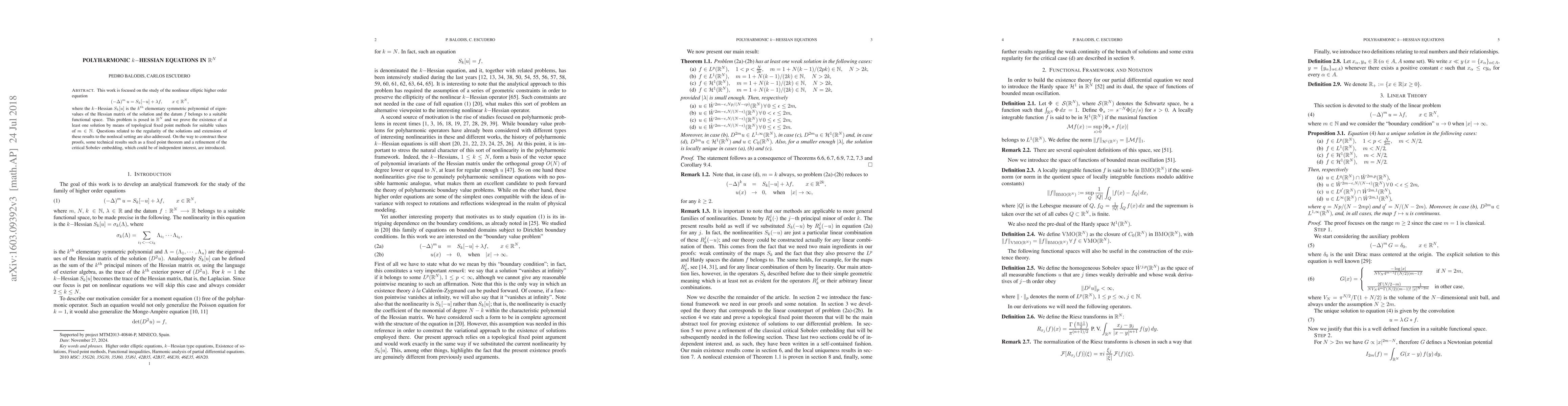 This work is focused on the study of the nonlinear elliptic higher order equation \begin{equation}\nonumber \left( -\Delta \right)^m u = S_k[-u] + \lambda f, \qquad x \in \mathbb{R}^N, \end{equation} where the $k-$Hessian $S_k[u]$ is the $k^{\mathrm{th}}$ elementary symmetric polynomial of eigenvalues of the Hessian matrix of the solution and the datum $f$ belongs to a suitable functional space. This problem is posed in $\mathbb{R}^N$ and we prove the existence of at least one solution by means of topological fixed point methods for suitable values of $m \in \mathbb{N}$. Questions related to the regularity of the solutions and extensions of these results to the nonlocal setting are also addressed. On the way to construct these proofs, some technical results such as a fixed point theorem and a refinement of the critical Sobolev embedding, which could be of independent interest, are introduced.