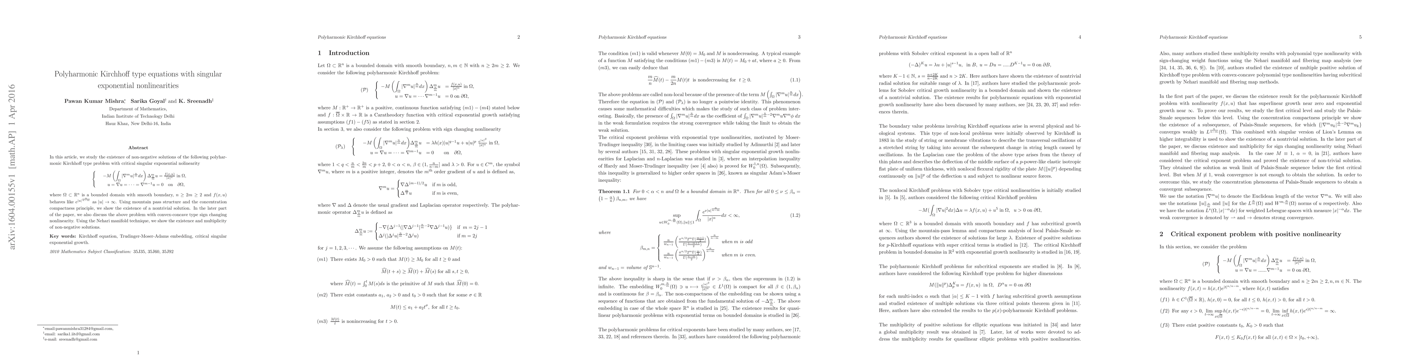 This paper investigates the existence of non-negative solutions for a polyharmonic Kirchhoff type equation with a critical singular exponential nonlinearity. Utilizing mountain pass theory and the concentration compactness principle, the authors demonstrate the existence of nontrivial solutions. The study also extends to sign-changing nonlinearities, proving the existence and multiplicity of non-negative solutions via the Nehari manifold technique.