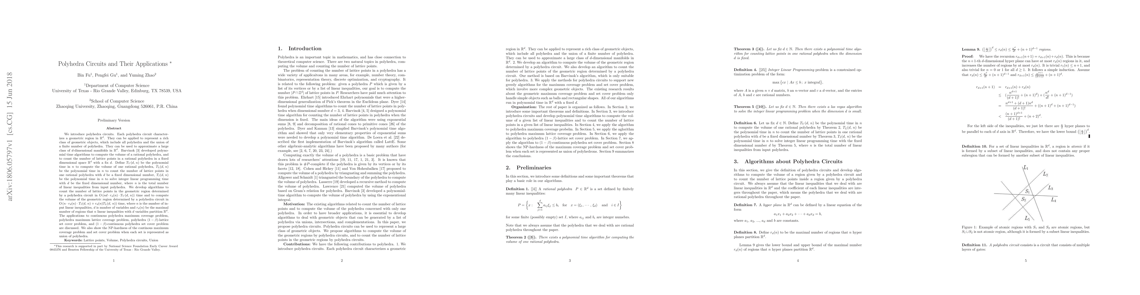 This paper introduces polyhedra circuits to represent geometric regions in $\mathbb{R}^d$, including polyhedra and their unions. It develops algorithms for computing volumes and lattice points in these regions, leveraging Barvinok's polynomial time methods.