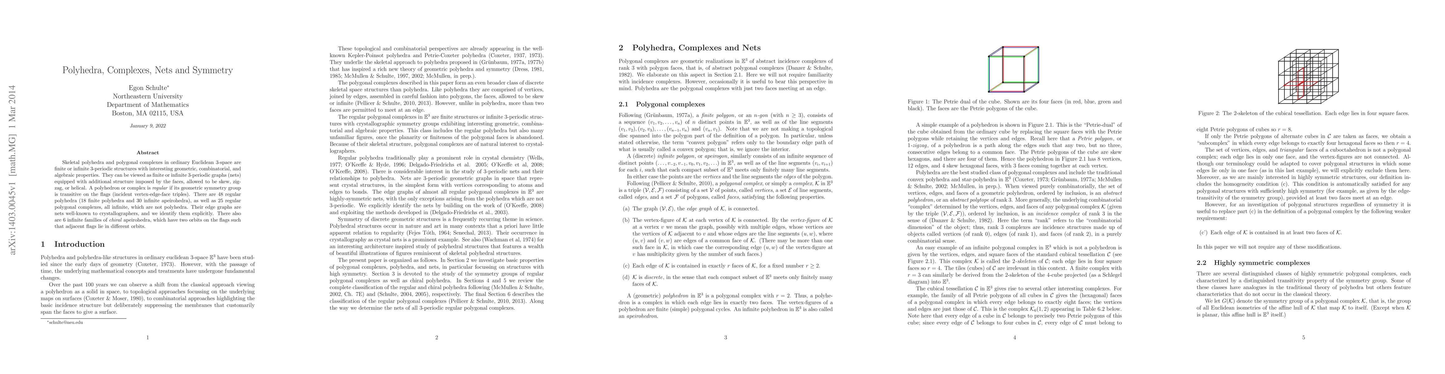 This paper explores the geometric, combinatorial, and algebraic properties of skeletal polyhedra and polygonal complexes in 3-space, focusing on their symmetry and classification. It identifies 48 regular polyhedra and 25 regular polygonal complexes, highlighting the structures' symmetry groups and their relevance to crystallography.