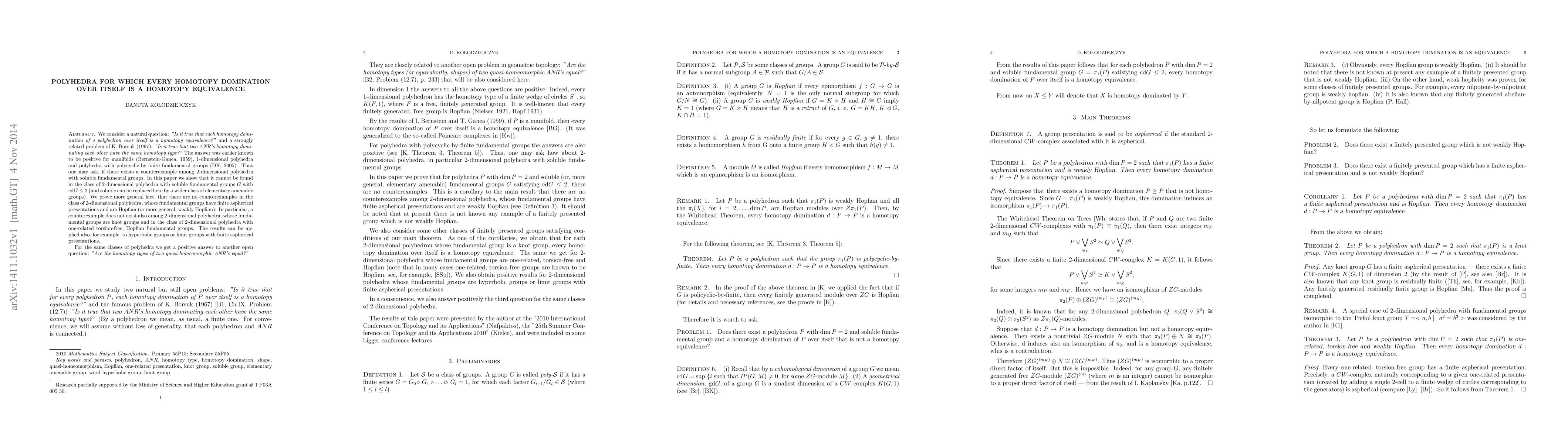 We consider a natural question: "Is it true that each homotopy domination of a polyhedron over itself is a homotopy equivalence?" and a strongly related problem of K. Borsuk (1967): "Is it true that two ANR's homotopy dominating each other have the same homotopy type?" The answer was earlier known to be positive for manifolds (Bernstein-Ganea, 1959), $1$-dimensional polyhedra and polyhedra with polycyclic-by-finite fundamental groups (DK, 2005). Thus one may ask, if there exists a counterexample among $2$-dimensional polyhedra with soluble fundamental groups. In this paper we show that it cannot be found in the class of $2$-dimensional polyhedra with soluble fundamental groups $G$ with cd$G \leq 2$ (and soluble can be replaced here by a wider class of elementary amenable groups). We prove more general fact, that there are no counterexamples among $2$-dimensional polyhedra, whose fundamental groups have finite aspherical presentations and are Hopfian (or more general, weakly Hopfian). In particular, a counterexample does not exist also among $2$-dimensional polyhedra whose fundamental groups are knot groups and in the class of $2$-dimensional polyhedra with one-related torsion-free Hopfian fundamental groups. The results can be applied also, for example, to hyperbolic groups or limit groups with finite aspherical presentations. For the same classes of polyhedra we get also a positive answer to another other open question: "Are the homotopy types of two quasi-homeomorphic ANR's equal?"