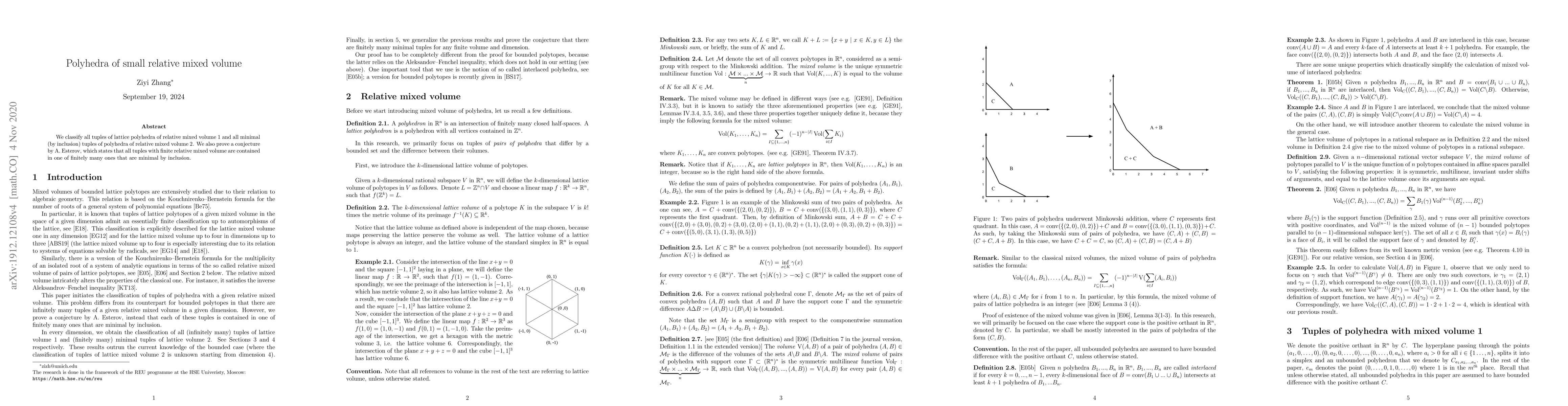 The paper classifies all tuples of lattice polyhedra with relative mixed volume 1 and identifies minimal tuples with relative mixed volume 2. It also proves a conjecture by Esterov regarding finite tuples with finite relative mixed volume.