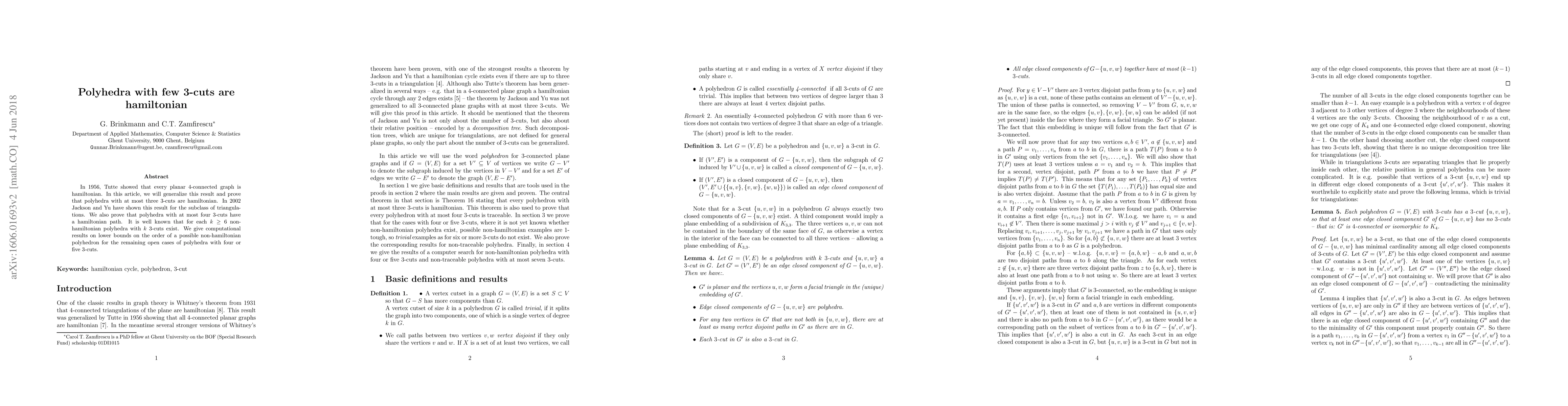 In 1956, Tutte showed that every planar 4-connected graph is hamiltonian. In this article, we will generalize this result and prove that polyhedra with at most three 3-cuts are hamiltonian. In 2002 Jackson and Yu have shown this result for the subclass of triangulations. We also prove that polyhedra with at most four 3-cuts have a hamiltonian path. It is well known that for each $k \ge 6$ non-hamiltonian polyhedra with $k$ 3-cuts exist. We give computational results on lower bounds on the order of a possible non-hamiltonian polyhedron for the remaining open cases of polyhedra with four or five 3-cuts.