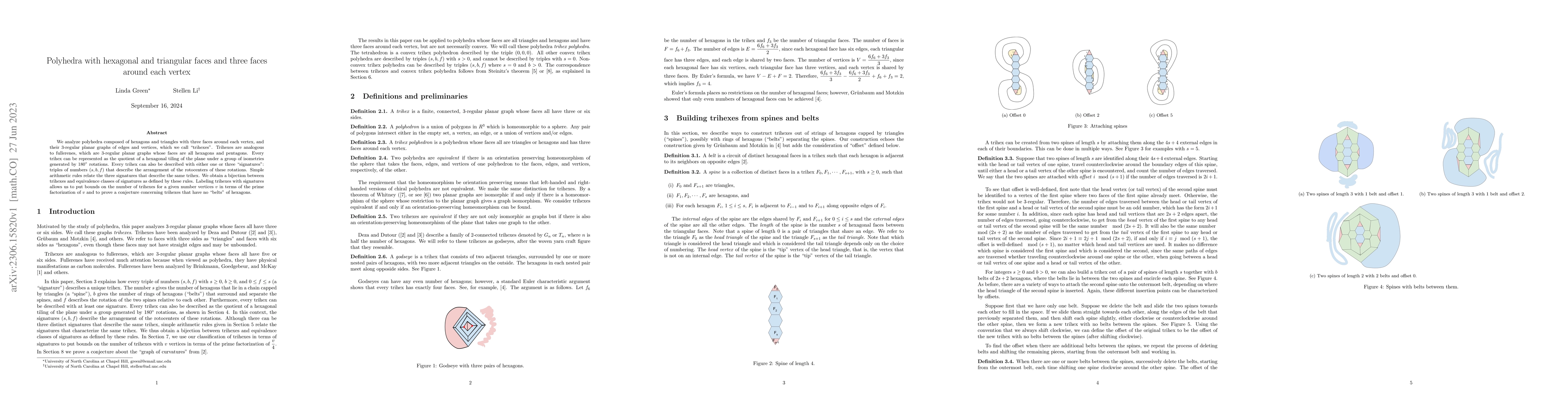 We analyze polyhedra composed of hexagons and triangles with three faces around each vertex, and their 3-regular planar graphs of edges and vertices, which we call "trihexes". Trihexes are analogous to fullerenes, which are 3-regular planar graphs whose faces are all hexagons and pentagons. Every trihex can be represented as the quotient of a hexagonal tiling of the plane under a group of isometries generated by $180^\circ$ rotations. Every trihex can also be described with either one or three "signatures": triples of numbers $(s, b, f)$ that describe the arrangement of the rotocenters of these rotations. Simple arithmetic rules relate the three signatures that describe the same trihex. We obtain a bijection between trihexes and equivalence classes of signatures as defined by these rules. Labeling trihexes with signatures allows us to put bounds on the number of trihexes for a given number vertices $v$ in terms of the prime factorization of $v$ and to prove a conjecture concerning trihexes that have no "belts" of hexagons.