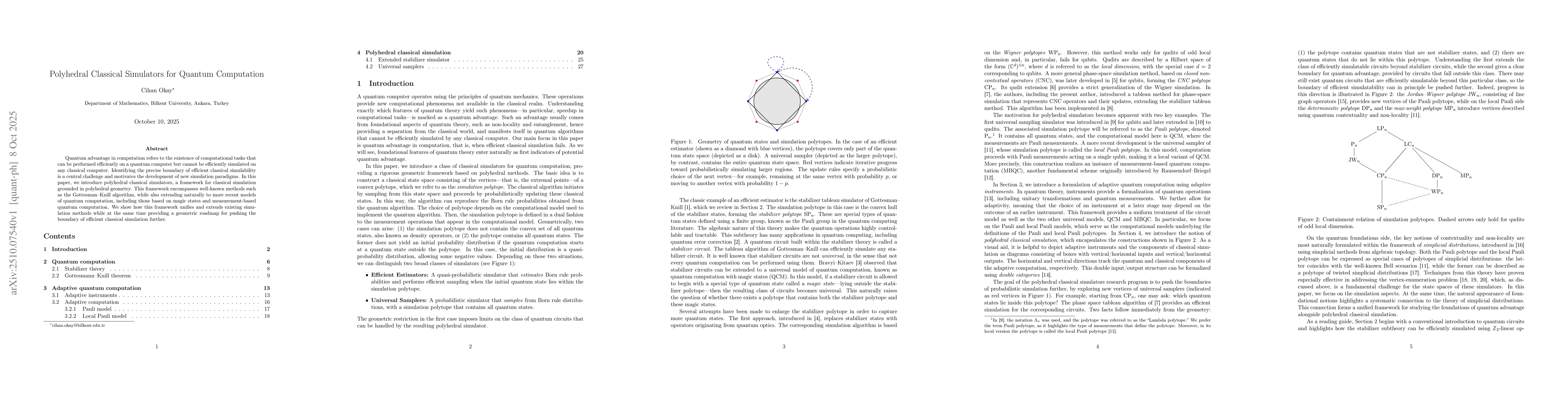 Quantum advantage in computation refers to the existence of computational tasks that can be performed efficiently on a quantum computer but cannot be efficiently simulated on any classical computer. Identifying the precise boundary of efficient classical simulability is a central challenge and motivates the development of new simulation paradigms. In this paper, we introduce polyhedral classical simulators, a framework for classical simulation grounded in polyhedral geometry. This framework encompasses well-known methods such as the Gottesman-Knill algorithm, while also extending naturally to more recent models of quantum computation, including those based on magic states and measurement-based quantum computation. We show how this framework unifies and extends existing simulation methods while at the same time providing a geometric roadmap for pushing the boundary of efficient classical simulation further.