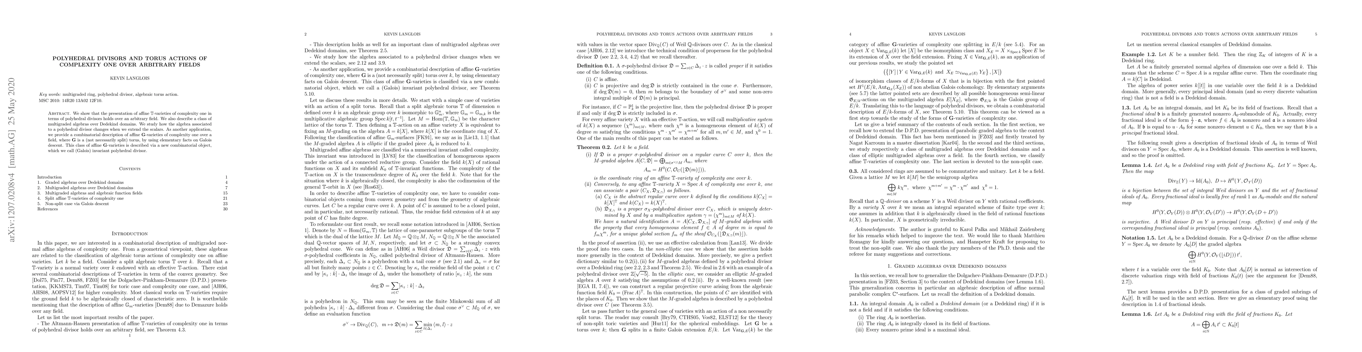This paper demonstrates that affine $\mathbb{T}$-varieties of complexity one can be presented using polyhedral divisors over any field, and introduces a class of multigraded algebras over Dedekind domains. It also explores the changes in associated algebras when scalars are extended and provides a combinatorial description of affine $\mathbf{G}$-varieties using Galois invariant polyhedral divisors.