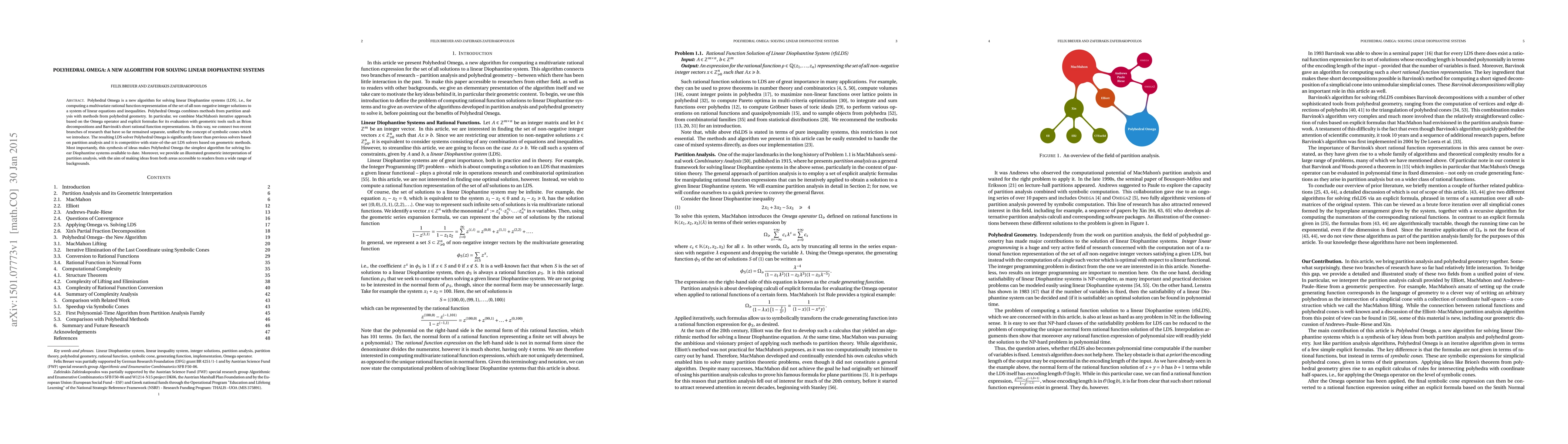 Polyhedral Omega is a novel algorithm for solving linear Diophantine systems by combining partition analysis and polyhedral geometry, offering a faster and simpler approach compared to previous methods. It integrates symbolic cones to unify these research areas and provides a geometric interpretation to enhance accessibility.