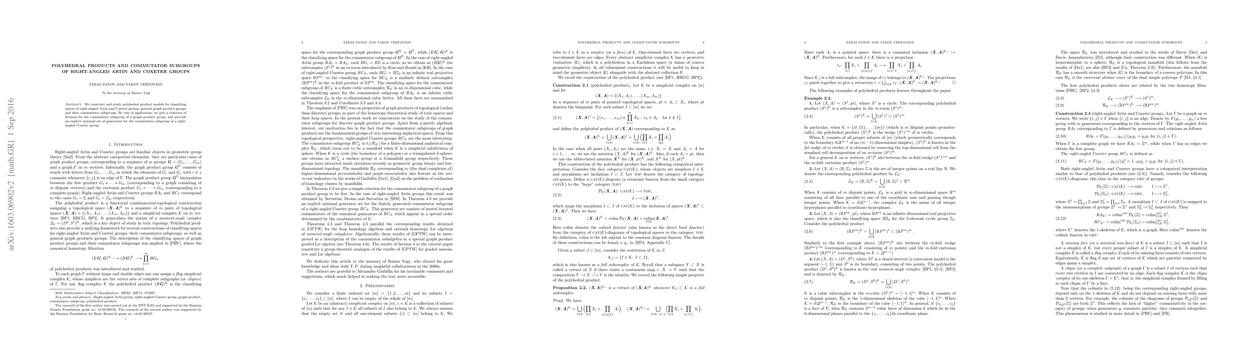 This paper constructs polyhedral product models for classifying spaces of right-angled Artin and Coxeter groups, general graph product groups, and their commutator subgroups. It provides a criterion for the freeness of the commutator subgroup of graph product groups and an explicit minimal generator set for the commutator subgroup of right-angled Coxeter groups.