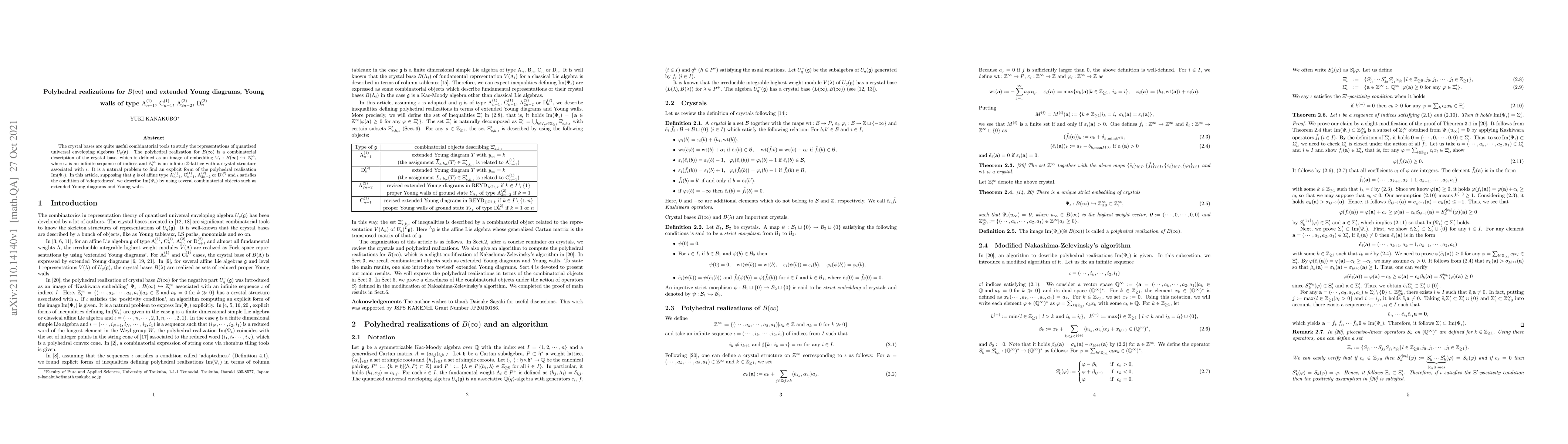 This paper explores the polyhedral realization for $B(\infty)$, a combinatorial description of crystal bases in quantized universal enveloping algebras. It provides explicit forms of this realization for affine types ${\rm A}^{(1)}_{n-1}$, ${\rm C}^{(1)}_{n-1}$, ${\rm A}^{(2)}_{2n-2}$, and ${\rm D}^{(2)}_{n}$ using extended Young diagrams and Young walls.