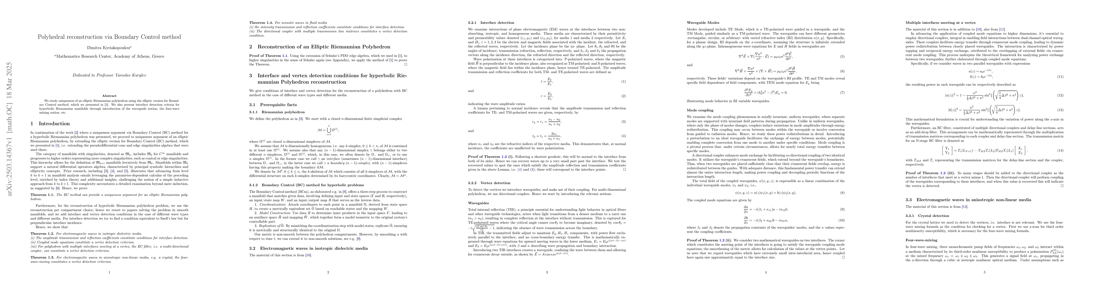 The paper presents an elliptic version of the Boundary Control method for polyhedral reconstruction and introduces new criteria for detecting interfaces in hyperbolic Riemannian manifolds.