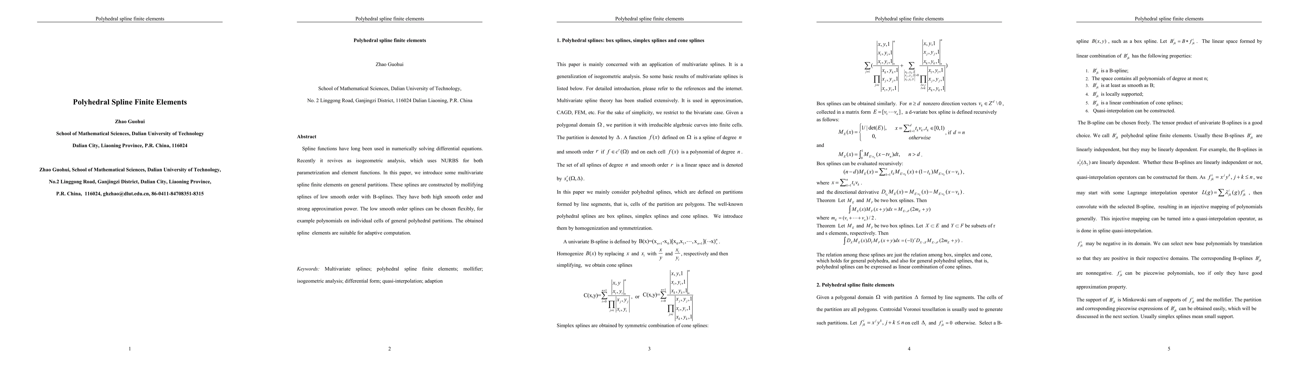 The paper presents polyhedral spline finite elements, which combine the advantages of both high smooth order and strong approximation power, constructed using mollified low-order splines and B-splines.
