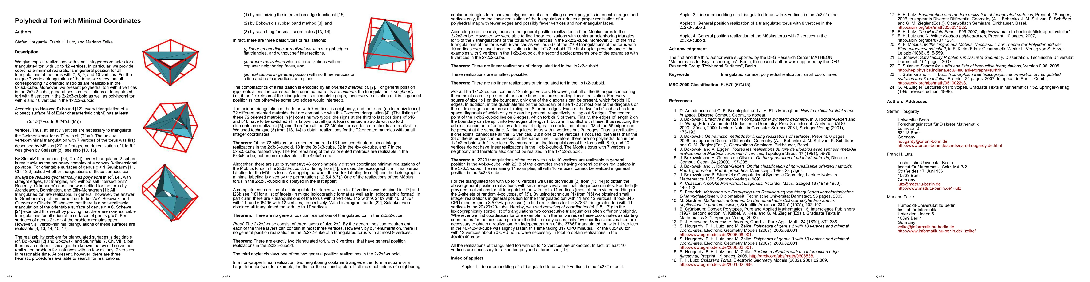 This paper presents explicit and minimal integer coordinate realizations for triangulated tori up to 12 vertices, focusing on triangulations with 7 to 10 vertices. It includes realizations in small cubes for various triangulations and confirms the realizability of all 72 oriented matroids for the unique 7-vertex triangulation within a 6x6x6-cube.