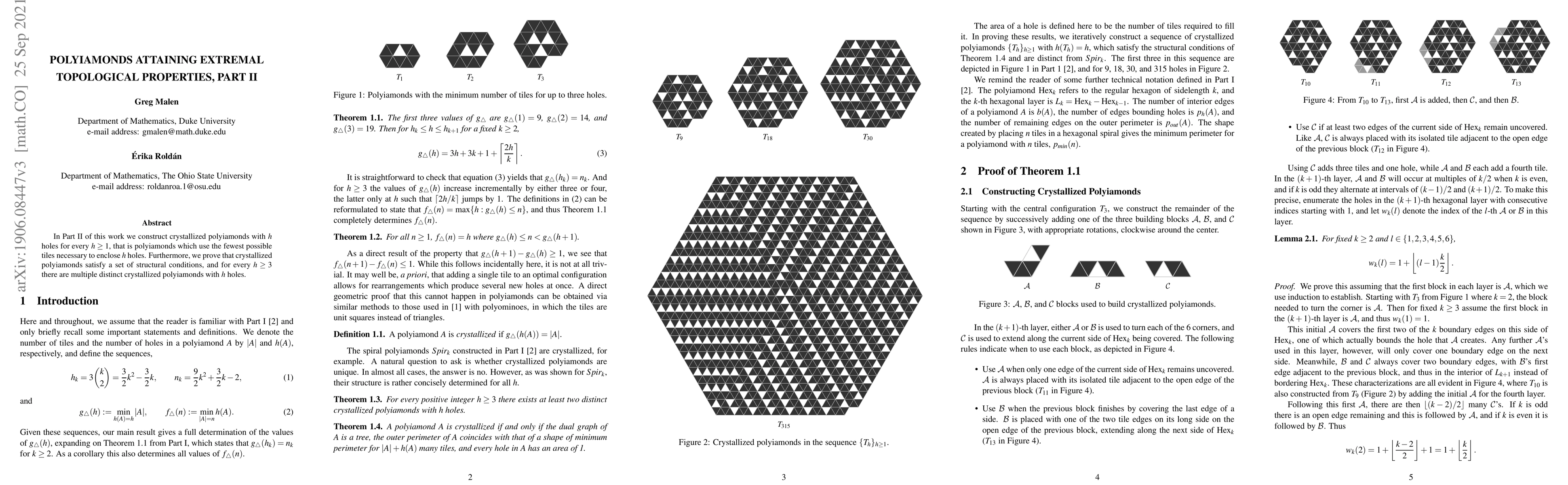 In Part II of this work, we construct crystallized polyiamonds with $h$ holes for every $h\ge1$, that is polyiamonds which use the fewest possible tiles necessary to enclose $h$ holes. Furthermore, we prove that crystallized polyiamonds satisfy a set of structural conditions, and for every $h\ge 3$ there are multiple distinct crystallized polyiamonds with $h$ holes.