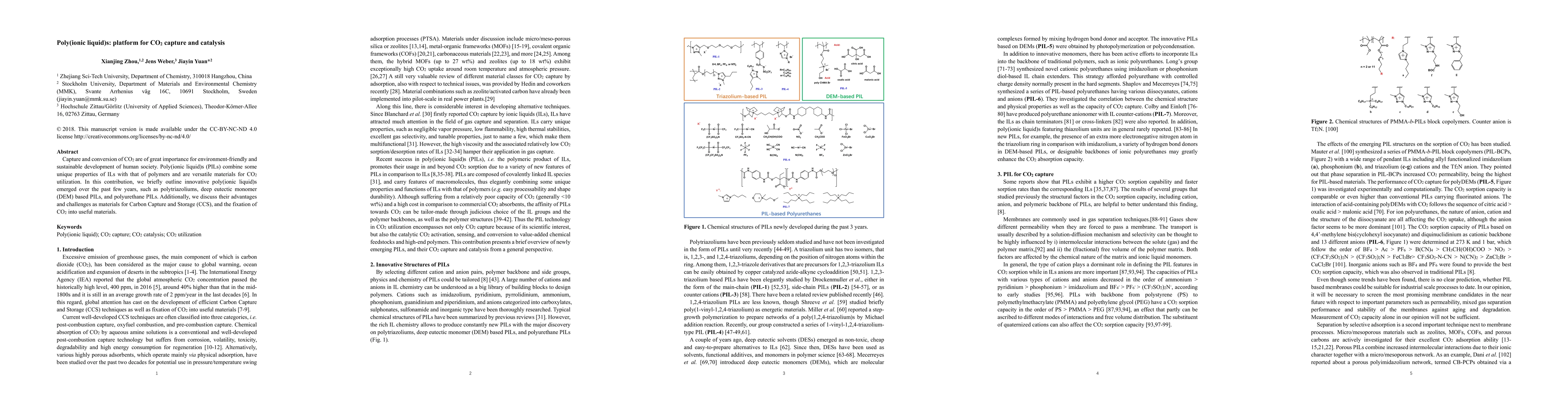 This paper reviews recent advancements in poly(ionic liquid)s (PILs) for CO2 capture and conversion, highlighting materials like polytriazoliums, deep eutectic monomer-based PILs, and polyurethane PILs. It discusses their potential benefits and challenges for Carbon Capture and Storage (CCS) and CO2 fixation into useful products.