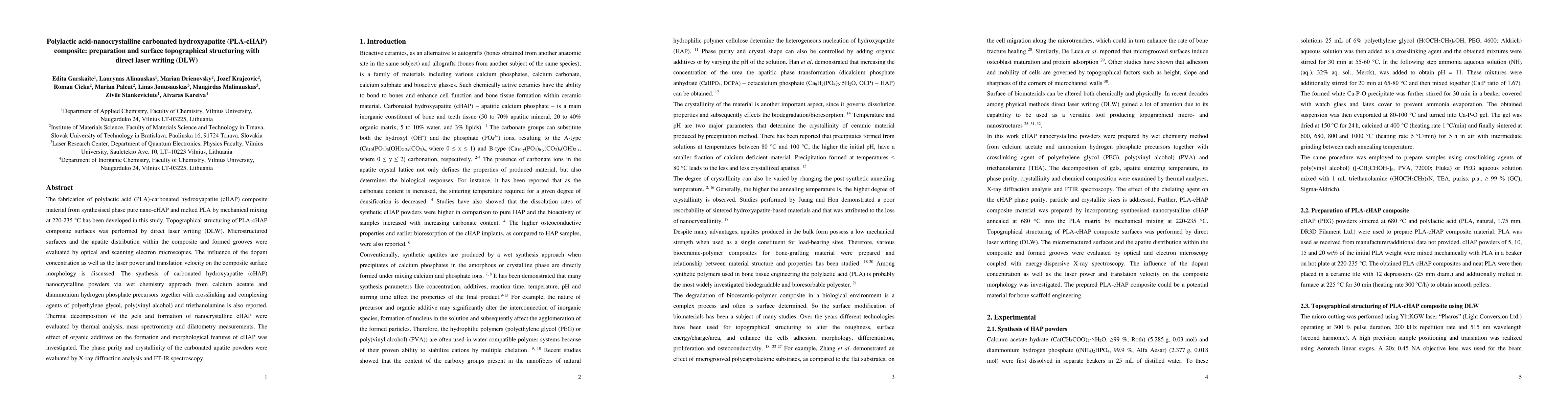 This study develops a polylactic acid (PLA)-carbonated hydroxyapatite (cHAP) composite material via mechanical mixing and investigates its surface structuring using direct laser writing (DLW). The research also details the synthesis of nanocrystalline cHAP via a wet chemistry approach and evaluates the influence of various parameters on the composite's surface morphology.