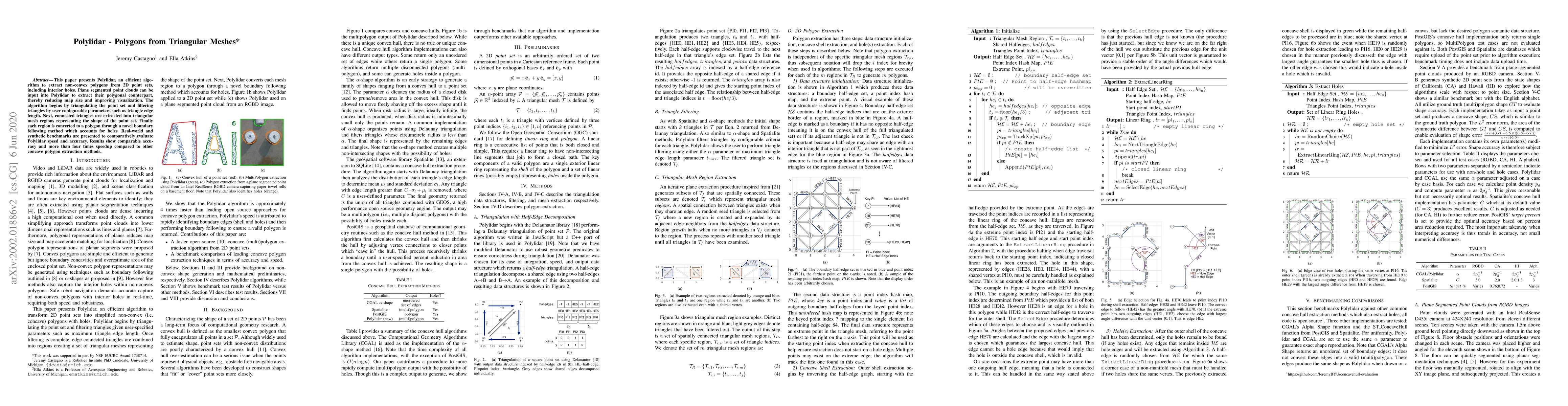 Polylidar is an efficient algorithm that extracts non-convex polygons from 2D point sets, including interior holes, by triangulating, filtering, and converting triangular mesh regions into polygons. It outperforms other methods with more than four times speedup and comparable accuracy.