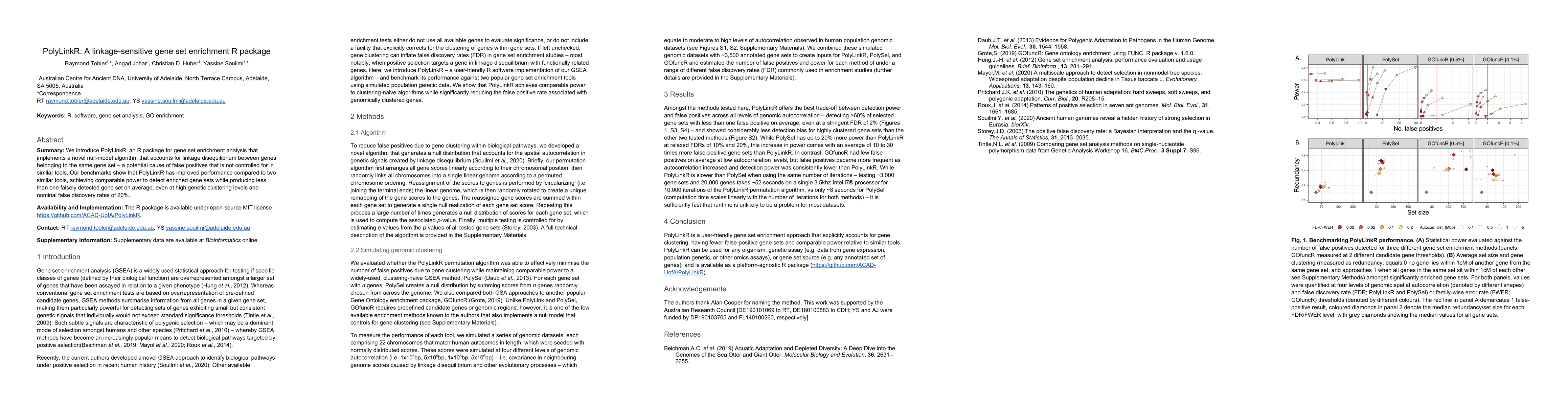 PolyLinkR is an R package that enhances gene set enrichment analysis by accounting for linkage disequilibrium among genes, reducing false positives. Benchmarks indicate it outperforms similar tools by detecting enriched gene sets with high accuracy and low false discovery rates.
