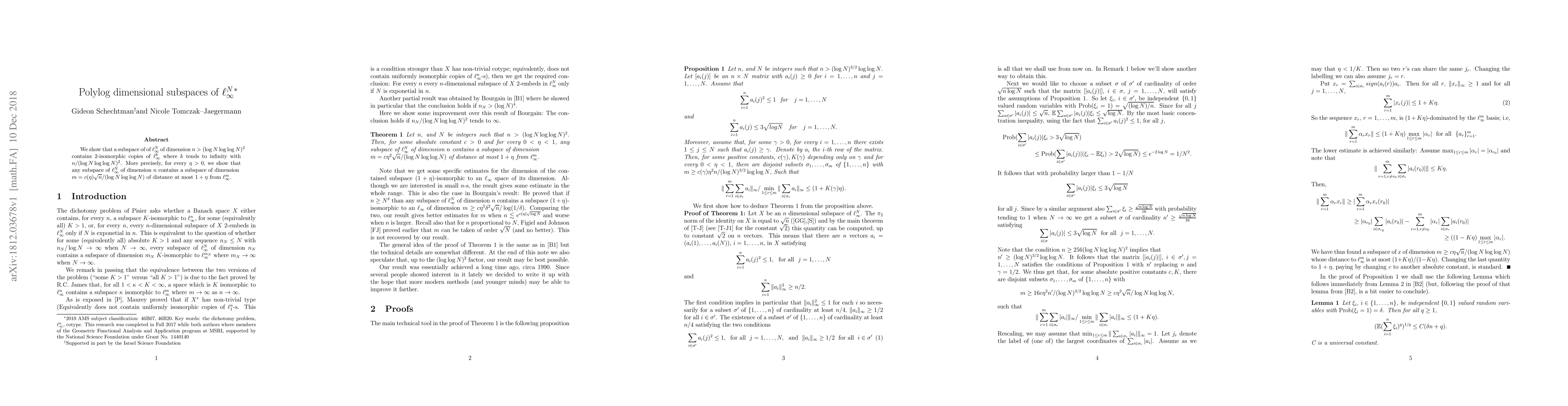 Summary: The paper demonstrates that high-dimensional subspaces of $\ell_\infty^N$ contain $2$-isomorphic copies of $\ell_\infty^k$ as the dimension grows, with $k$ scaling proportionally to $n/(\log N\log \log N)^2$. Specifically, any such subspace of dimension $n$ includes a smaller subspace of dimension $m$ that is nearly isometric to $\ell_\infty^m$.