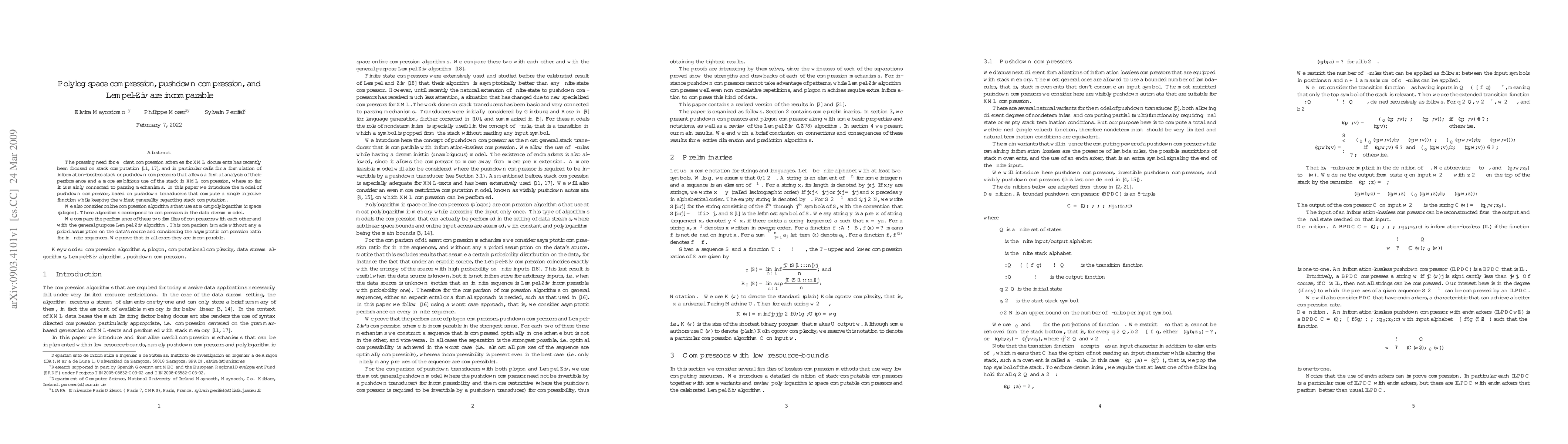 The pressing need for efficient compression schemes for XML documents has recently been focused on stack computation, and in particular calls for a formulation of information-lossless stack or pushdown compressors that allows a formal analysis of their performance and a more ambitious use of the stack in XML compression, where so far it is mainly connected to parsing mechanisms. In this paper we introduce the model of pushdown compressor, based on pushdown transducers that compute a single injective function while keeping the widest generality regarding stack computation. We also consider online compression algorithms that use at most polylogarithmic space (plogon). These algorithms correspond to compressors in the data stream model. We compare the performance of these two families of compressors with each other and with the general purpose Lempel-Ziv algorithm. This comparison is made without any a priori assumption on the data's source and considering the asymptotic compression ratio for infinite sequences. We prove that in all cases they are incomparable.