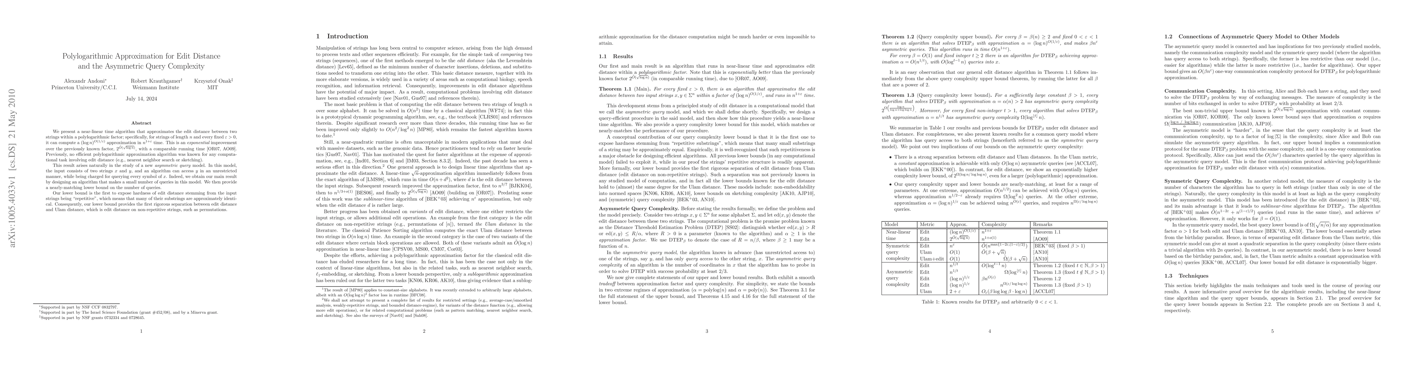This paper introduces a near-linear time algorithm that approximates edit distance between two strings within a polylogarithmic factor, representing an exponential improvement over previous methods. The study also explores a new asymmetric query model, revealing a rigorous separation between edit distance and Ulam distance based on string repetitiveness.