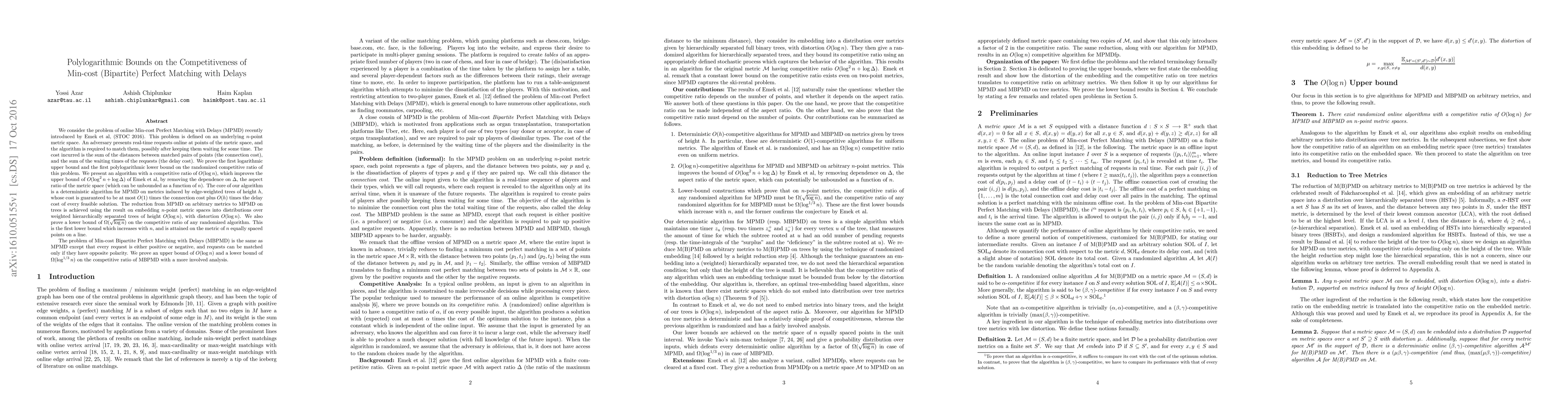 We consider the problem of online Min-cost Perfect Matching with Delays (MPMD) recently introduced by Emek et al, (STOC 2016). This problem is defined on an underlying $n$-point metric space. An adversary presents real-time requests online at points of the metric space, and the algorithm is required to match them, possibly after keeping them waiting for some time. The cost incurred is the sum of the distances between matched pairs of points (the connection cost), and the sum of the waiting times of the requests (the delay cost). We present an algorithm with a competitive ratio of $O(\log n)$, which improves the upper bound of $O(\log^2n+\log\Delta)$ of Emek et al, by removing the dependence on $\Delta$, the aspect ratio of the metric space (which can be unbounded as a function of $n$). The core of our algorithm is a deterministic algorithm for MPMD on metrics induced by edge-weighted trees of height $h$, whose cost is guaranteed to be at most $O(1)$ times the connection cost plus $O(h)$ times the delay cost of every feasible solution. The reduction from MPMD on arbitrary metrics to MPMD on trees is achieved using the result on embedding $n$-point metric spaces into distributions over weighted hierarchically separated trees of height $O(\log n)$, with distortion $O(\log n)$. We also prove a lower bound of $\Omega(\sqrt{\log n})$ on the competitive ratio of any randomized algorithm. This is the first lower bound which increases with $n$, and is attained on the metric of $n$ equally spaced points on a line. The problem of Min-cost Bipartite Perfect Matching with Delays (MBPMD) is the same as MPMD except that every request is either positive or negative, and requests can be matched only if they have opposite polarity. We prove an upper bound of $O(\log n)$ and a lower bound of $\Omega(\log^{1/3}n)$ on the competitive ratio of MBPMD with a more involved analysis.