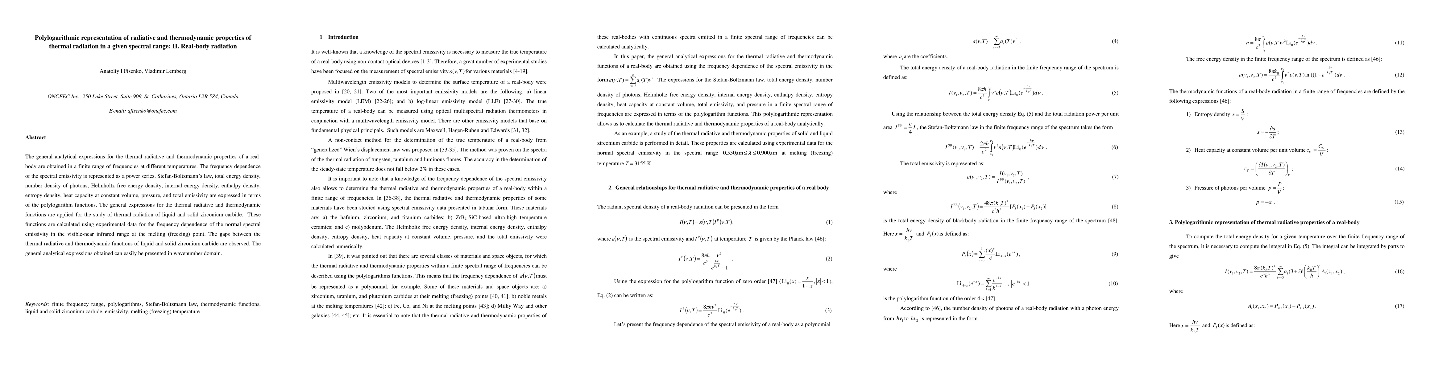 This paper derives analytical expressions for thermal radiative and thermodynamic properties of real bodies using polylogarithm functions, applied to zirconium carbide. It highlights differences in thermal radiative functions between liquid and solid states, utilizing experimental data for spectral emissivity.
