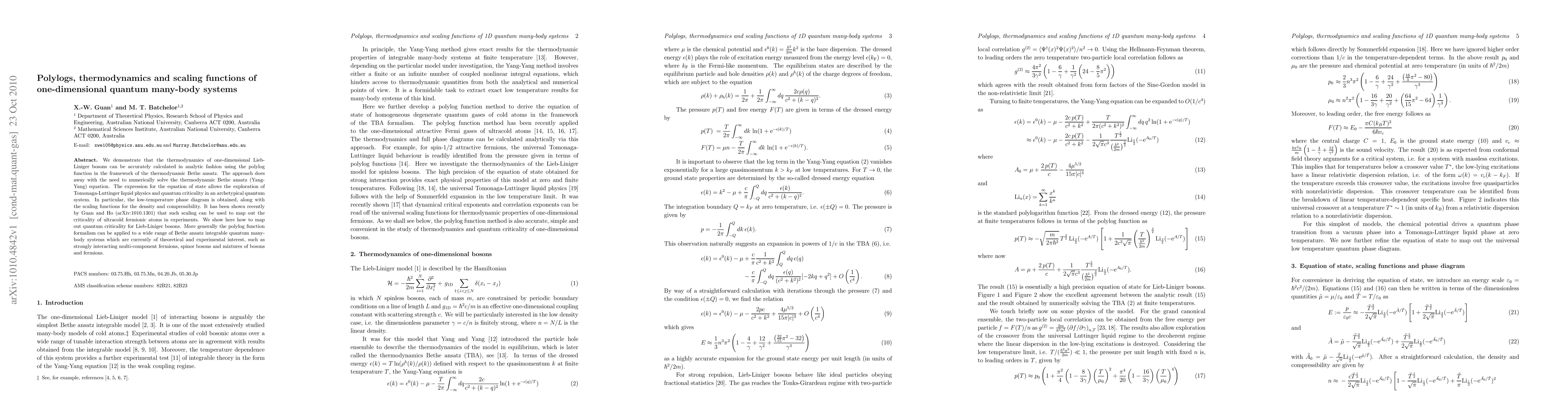 We demonstrate that the thermodynamics of one-dimensional Lieb-Liniger bosons can be accurately calculated in analytic fashion using the polylog function in the framework of the thermodynamic Bethe ansatz. The approach does away with the need to numerically solve the thermodynamic Bethe ansatz (Yang-Yang) equation. The expression for the equation of state allows the exploration of Tomonaga-Luttinger liquid physics and quantum criticality in an archetypical quantum system. In particular, the low-temperature phase diagram is obtained, along with the scaling functions for the density and compressibility. It has been shown recently by Guan and Ho (arXiv:1010.1301) that such scaling can be used to map out the criticality of ultracold fermionic atoms in experiments. We show here how to map out quantum criticality for Lieb-Liniger bosons. More generally the polylog function formalism can be applied to a wide range of Bethe ansatz integrable quantum many-body systems which are currently of theoretical and experimental interest, such as strongly interacting multi-component fermions, spinor bosons and mixtures of bosons and fermions.