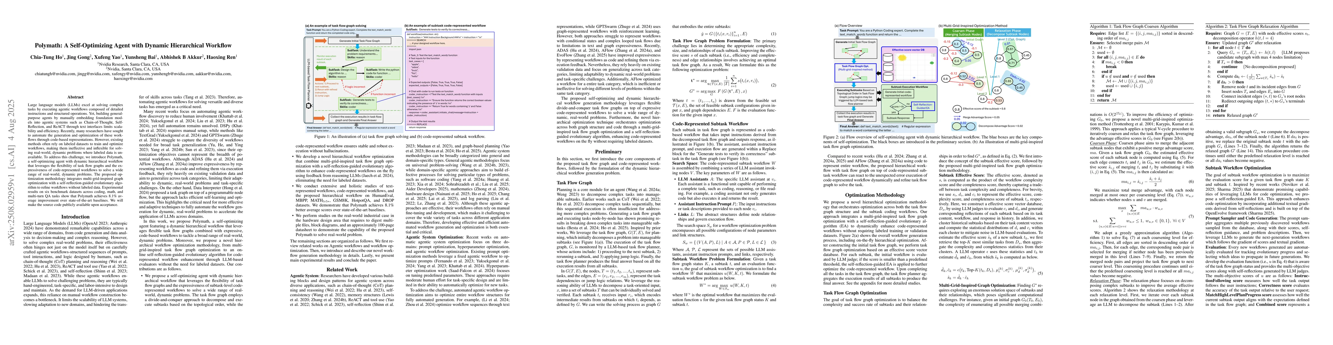 Large language models (LLMs) excel at solving complex tasks by executing agentic workflows composed of detailed instructions and structured operations. Yet, building general-purpose agents by manually embedding foundation models into agentic systems such as Chain-of-Thought, Self-Reflection, and ReACT through text interfaces limits scalability and efficiency. Recently, many researchers have sought to automate the generation and optimization of these workflows through code-based representations. However, existing methods often rely on labeled datasets to train and optimize workflows, making them ineffective and inflexible for solving real-world, dynamic problems where labeled data is unavailable. To address this challenge, we introduce Polymath, a self-optimizing agent with dynamic hierarchical workflow that leverages the flexibility of task flow graphs and the expressiveness of code-represented workflows to solve a wide range of real-world, dynamic problems. The proposed optimization methodology integrates multi-grid-inspired graph optimization with a self-reflection-guided evolutionary algorithm to refine workflows without labeled data. Experimental results on six benchmark datasets across coding, math, and multi-turn QA tasks show that Polymath achieves 8.1% average improvement over state-of-the-art baselines.