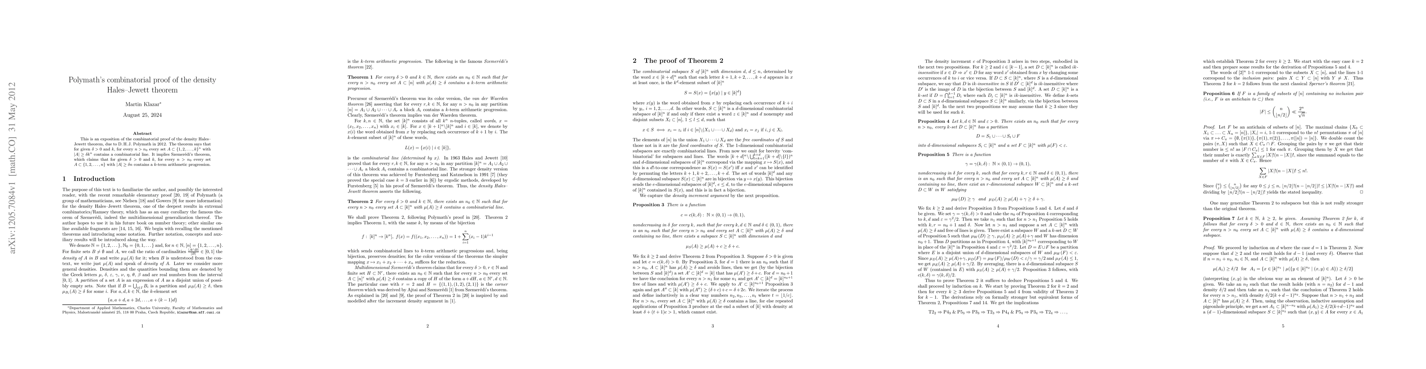 Summary: The paper presents a combinatorial proof by D. H. J. Polymath for the density Hales-Jewett theorem, which guarantees the existence of combinatorial lines in sufficiently large dense subsets of $\{1,2,\ldots,k\}^n$, and implies Szemerédi's theorem on arithmetic progressions.