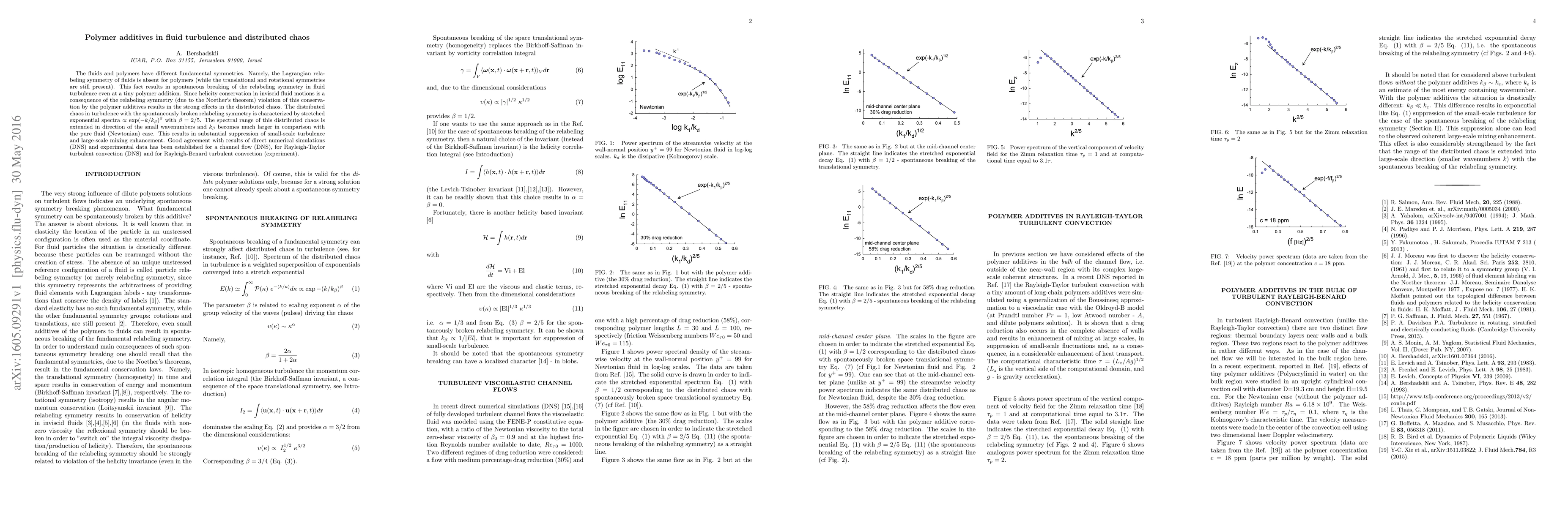 The fluids and polymers have different fundamental symmetries. Namely, the Lagrangian relabeling symmetry of fluids is absent for polymers (while the translational and rotational symmetries are still present). This fact results in spontaneous breaking of the relabeling symmetry in fluid turbulence even at a tiny polymer addition. Since helicity conservation in inviscid fluid motions is a consequence of the relabeling symmetry (due to the Noether's theorem) violation of this conservation by the polymer additives results in the strong effects in the distributed chaos. The distributed chaos in turbulence with the spontaneously broken relabeling symmetry is characterized by stretched exponential spectra $\propto \exp(-k/k_{\beta})^{\beta}$ with $\beta =2/5$. The spectral range of this distributed chaos is extended in direction of the small wavenumbers and $k_{\beta}$ becomes much larger in comparison with the pure fluid (Newtonian) case. This results in substantial suppression of small-scale turbulence and large-scale mixing enhancement. Good agreement with results of direct numerical simulations (DNS) and experimental data has been established for a channel flow (DNS), for Rayleigh-Taylor turbulent convection (DNS) and for Rayleigh-Benard turbulent convection (experiment).