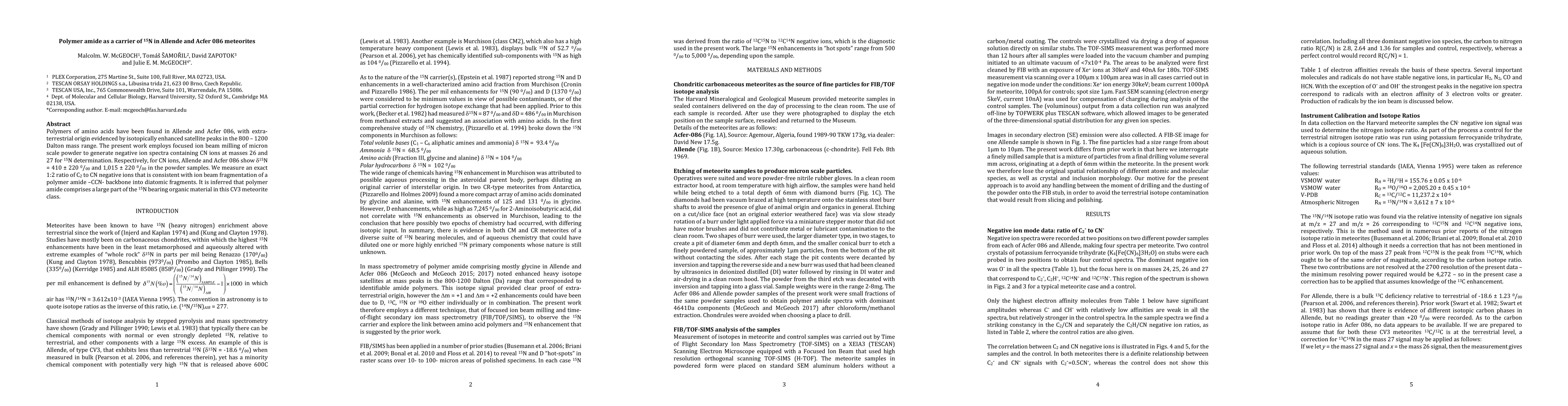 Polymers of amino acids have been found in Allende and Acfer 086, with extra-terrestrial origin evidenced by isotopically enhanced satellite peaks in the 800-1200 Dalton mass range. The present work employs focused ion beam milling of micron scale powder to generate negative ion spectra containing CN ions at masses 26 and 27 for 15N determination. Respectively, for CN ions, Allende and Acfer 086 show delta 15N = 410 +/- 220 per mil and 1,015 +/- 220 per mil in the powder samples. We measure an exact 1:2 ratio of C2 to CN negative ions that is consistent with ion beam fragmentation of a polymer amide -CCN- backbone into diatomic fragments. It is inferred that polymer amide comprises a large part of the 15N bearing organic material in this CV3 meteorite class.