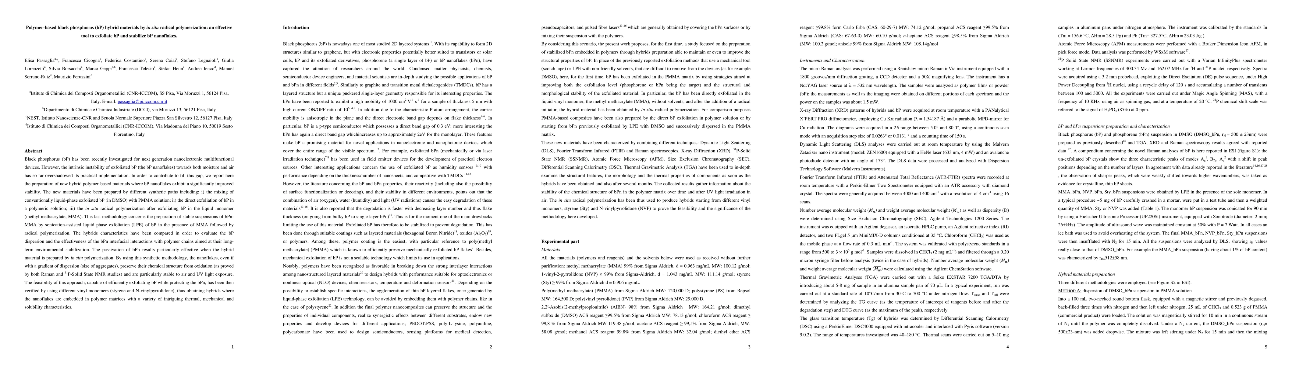 Black phosphorus (bP) has been recently investigated for next generation nanoelectronic multifunctional devices. However, the intrinsic instability of exfoliated bP (the bP nanoflakes) towards both moisture and air has so far overshadowed its practical implementation. In order to contribute to fill this gap, we report here the preparation of new hybrid polymer-based materials where bP nanoflakes exhibit a significantly improved stability. The new materials have been prepared by different synthetic paths including: i) the mixing of conventionally liquid-phase exfoliated bP (in DMSO) with PMMA solution; ii) the direct exfoliation of bP in a polymeric solution; iii) the in situ radical polymerization after exfoliating bP in the liquid monomer (methyl methacrylate, MMA). This last methodology concerns the preparation of stable suspensions of bPn-MMA by sonication-assisted liquid phase exfoliation (LPE) of bP in the presence of MMA followed by radical polymerization. The hybrids characteristics have been compared in order to evaluate the bP dispersion and the effectiveness of the bPn interfacial interactions with polymer chains aimed at their long-term environmental stabilization. The passivation of bPn results particularly effective when the hybrid material is prepared by in situ polymerization. By using this synthetic methodology, the nanoflakes, even if with a gradient of dispersion (size of aggregates), preserve their chemical structure from oxidation (as proved by both Raman and 31P-Solid State NMR studies) and are particularly stable to air and UV light exposure.