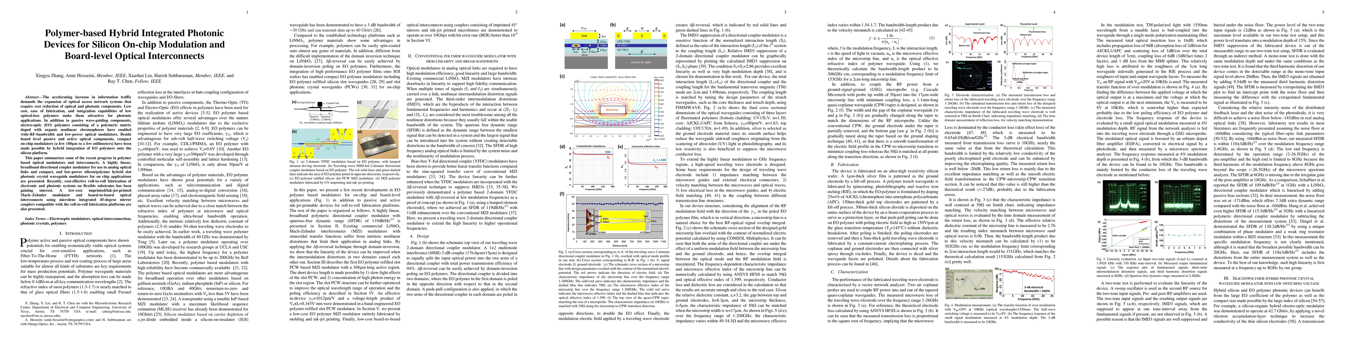 This paper reviews recent advancements in polymer-based hybrid photonic devices for silicon on-chip modulation and board-level optical interconnects, focusing on low-cost, low-loss, and easy-to-fabricate polymer modulators, including broadband directional couplers and compact silicon/polymer hybrid waveguide modulators, along with cost-effective roll-to-roll fabrication techniques.