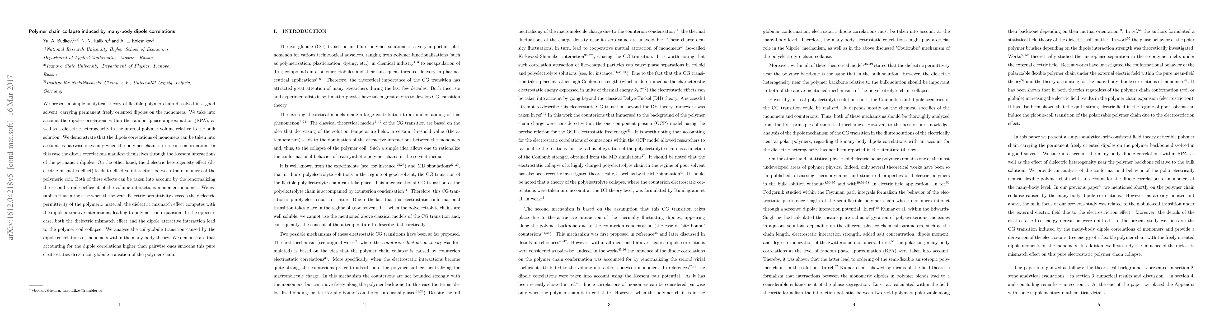 We present a simple analytical theory of flexible polymer chain dissolved in a good solvent, carrying permanent freely oriented dipoles on the monomers. We take into account the dipole correlations within the random phase approximation (RPA), as well as a dielectric heterogeneity in the internal polymer volume relative to the bulk solution. We demonstrate that the dipole correlations of monomers can be taken into account as pairwise ones only when the polymer chain is in a coil conformation. In this case the dipole correlations manifest themselves through the Keesom interactions of the permanent dipoles. On the other hand, the dielectric heterogeneity effect (dielectric mismatch effect) leads to effective interaction between the monomers of the polymeric coil. Both of these effects can be taken into account by the renormalizing the second virial coefficient of the volume interactions monomer-monomer. We establish that in the case when the solvent dielectric permittivity exceeds the dielectric permittivity of the polymeric material, the dielectric mismatch effect competes with the dipole attractive interactions, leading to polymer coil expansion. In the opposite case, both the dielectric mismatch effect and the dipole attractive interaction lead to the polymer coil collapse. We analyse the coil-globule transition caused by the dipole correlations of monomers within the many-body theory. We demonstrate that accounting for the dipole correlations higher than pairwise ones smooths this pure electrostatics driven coil-globule transition of the polymer chain.