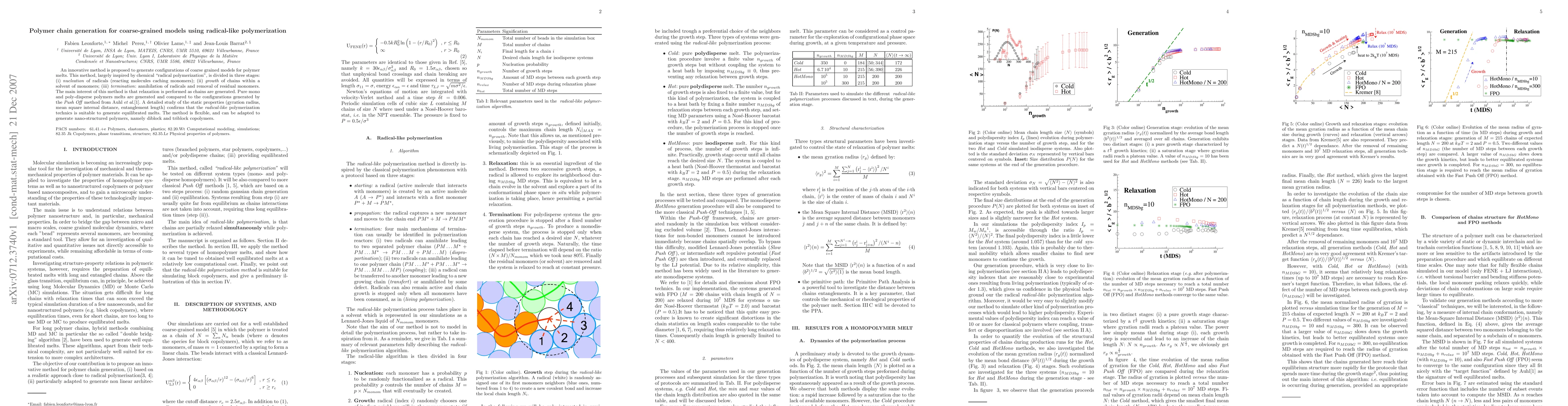 An innovative method is proposed to generate configurations of coarse grained models for polymer melts. This method, largely inspired by chemical ``radical polymerization'', is divided in three stages: (i) nucleation of radicals (reacting molecules caching monomers); (ii) growth of chains within a solvent of monomers; (iii) termination: annihilation of radicals and removal of residual monomers. The main interest of this method is that relaxation is performed as chains are generated. Pure mono and poly-disperse polymers melts are generated and compared to the configurations generated by the Push Off method from Auhl et al.. A detailed study of the static properties (gyration radius, mean square internal distance, entanglement length) confirms that the radical-like polymerization technics is suitable to generate equilibrated melts. The method is flexible, and can be adapted to generate nano-structured polymers, namely diblock and triblock copolymers.