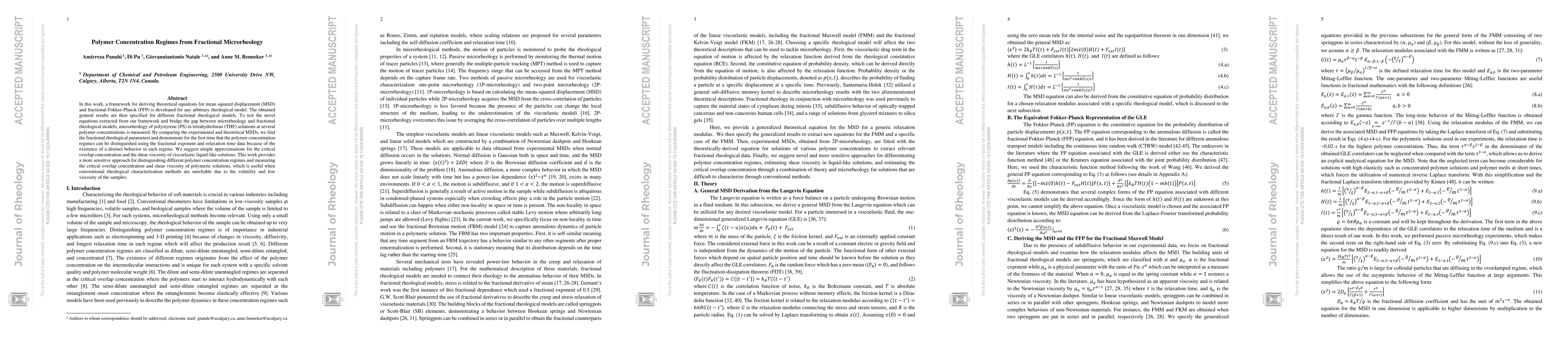 This research develops theoretical equations for mean squared displacement and fractional Fokker-Planck models to distinguish polymer concentration regimes using fractional rheology. Experiments on polystyrene solutions show distinct behaviors in different concentration regimes, enabling more sensitive characterization of critical overlap concentration and shear viscosity.