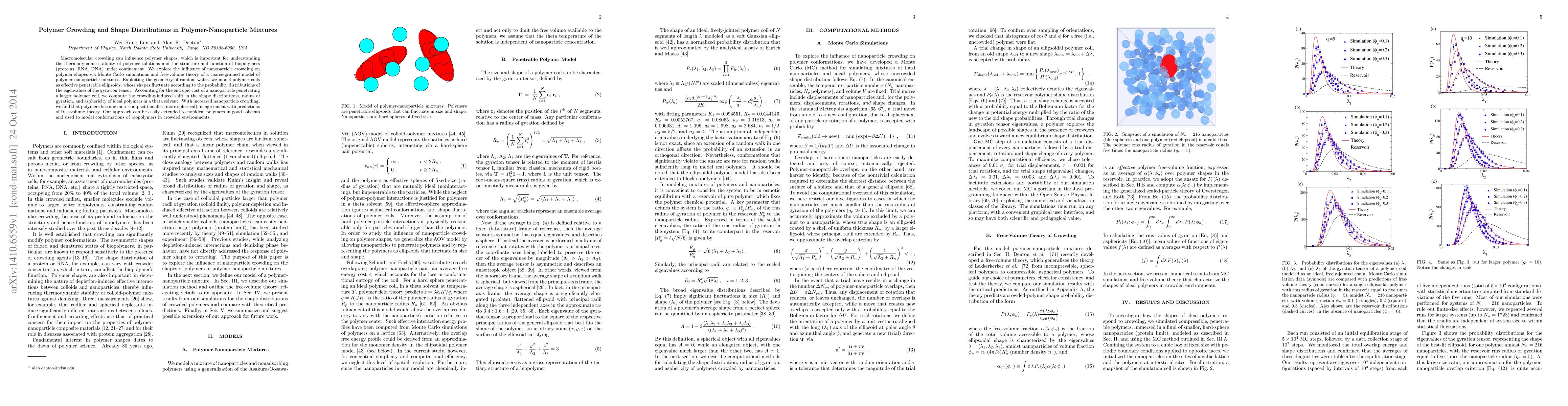 This study employs Monte Carlo simulations and free-volume theory to examine how nanoparticle crowding affects polymer shapes, finding that increased crowding makes polymers more compact and spherical. The approach is versatile and can model biopolymer conformations in crowded environments.