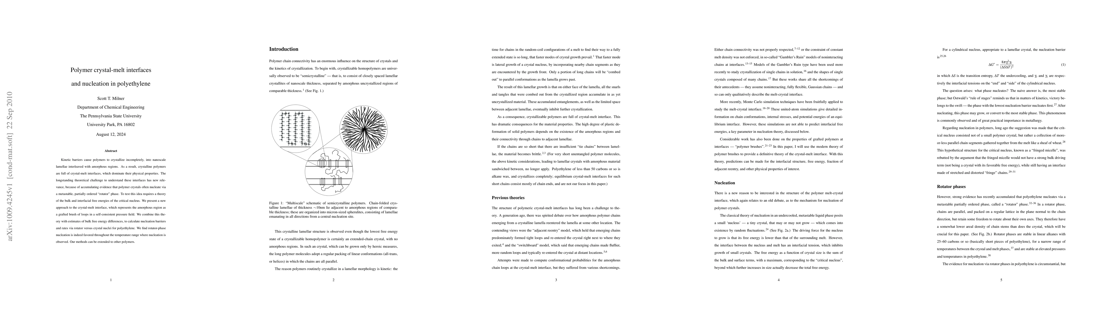 This paper develops a new theoretical approach to understand polymer crystal-melt interfaces and nucleation in polyethylene, showing that nucleation often occurs via a metastable "rotator" phase rather than directly from the melt. The method represents the amorphous region as a grafted brush, providing insights into nucleation barriers and rates.