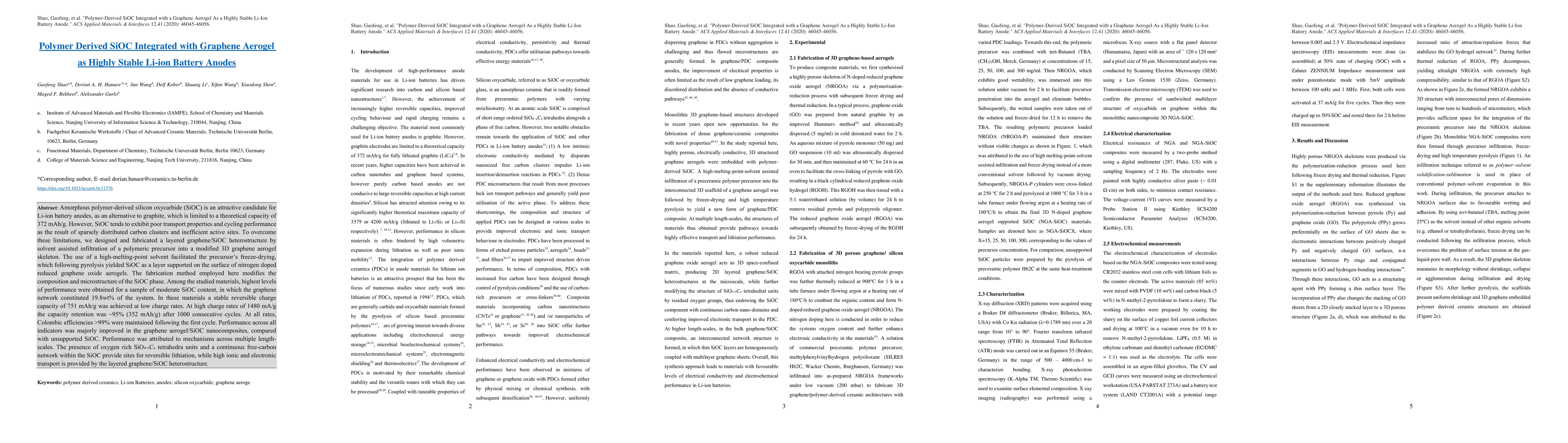 Amorphous polymer derived silicon oxycarbide (SiOC) is an attractive candidate for Lithium ion battery anodes, as an alternative to graphite, which is limited to a theoretical capacity of 372 mAh/g. However, SiOC tends to exhibit poor transport properties and cycling performance as a result of sparsely distributed carbon clusters and inefficient active sites. To overcome these limitations, we designed and fabricated a layered graphene SiOC heterostructure by solvent assisted infiltration of a polymeric precursor into a modified three dimensional graphene aerogel skeleton. The use of a high melting point solvent facilitated the precursors freeze drying, which following pyrolysis yielded SiOC as a layer supported on the surface of nitrogen doped reduced graphene oxide aerogels. The fabrication method employed here modifies the composition and microstructure of the SiOC phase. Among the studied materials, the highest levels of performance were obtained for a sample of moderate SiOC content, in which the graphene network constituted 19.8 wt % of the system. In these materials, a stable reversible charge capacity of 751 mAh/g was achieved at low charge rates. At high charge rates of 1480 mA/g, the capacity retention was ca. 95% (352 mAh/g) after 1000 consecutive cycles. At all rates, Coulombic efficiencies greater than 99% were maintained following the first cycle. Performance across all indicators was majorly improved in the graphene aerogel SiOC nanocomposites, compared with unsupported SiOC. The performance was attributed to mechanisms across multiple length scales. The presence of oxygen rich SiO4-xCx tetrahedral units and a continuous free carbon network within the SiOC provides sites for reversible lithiation, while high ionic and electronic transport is provided by the layered graphene SiOC heterostructure.