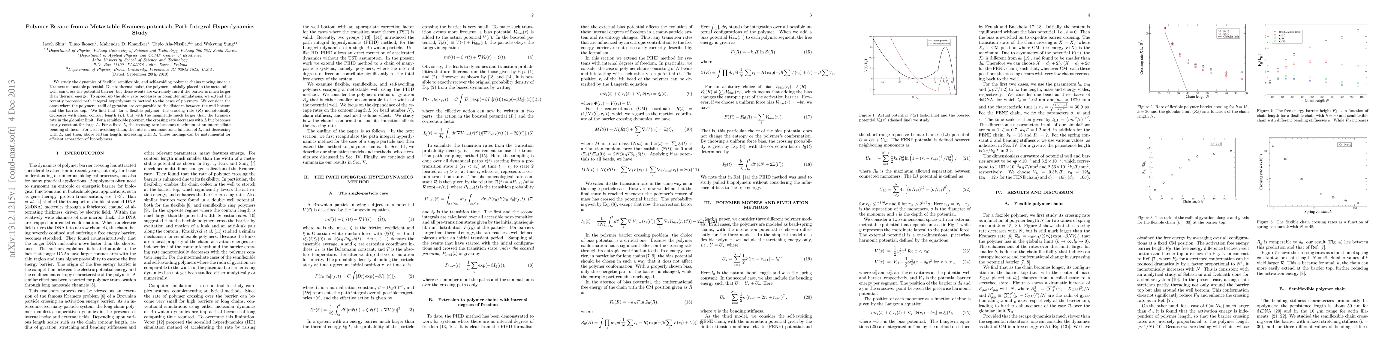 This study investigates the escape dynamics of polymer chains from a metastable Kramers potential using path integral hyperdynamics, revealing distinct crossing rates for flexible, semiflexible, and self-avoiding polymers based on their contour length and bending stiffness. The findings provide insights into the separation of biopolymers.