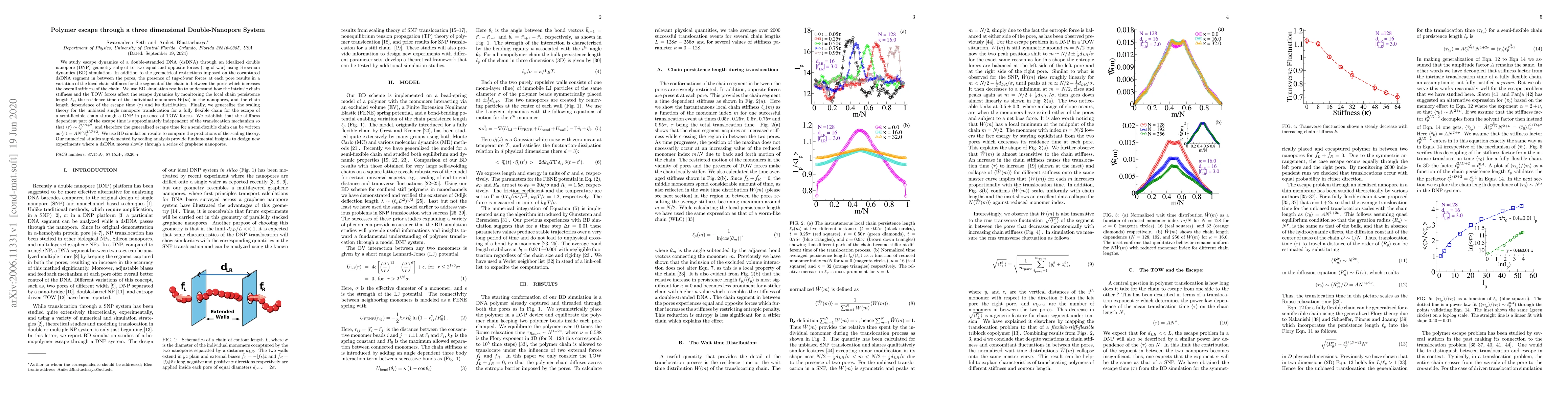 We study escape dynamics of a double-stranded DNA (dsDNA) through an idealized double nanopore (DNP) geometry subject to two equal and opposite forces (tug-of-war) using Brownian dynamics (BD) simulation. In addition to the geometrical restrictions imposed on the cocaptured dsDNA segment in between the pores, the presence of tug-of-war forces at each pore results in a variation of the local chain stiffness for the segment of the chain in between the pores which increases the overall stiffness of the chain. We use BD simulation results to understand how the intrinsic chain stiffness and the TOW forces affect the escape dynamics by monitoring the local chain persistence length $\ell_p$, the residence time of the individual monomers $W(m)$ in the nanopores, and the chain length dependence of the escape time $\langle \tau \rangle$ and its distribution. Finally, we generalize the scaling theory for the unbiased single nanopore translocation for a fully flexible chain for the escape of a semi-flexible chain through a DNP in presence of TOW forces. We establish that the stiffness dependent part of the escape time is approximately independent of the translocation mechanism so that $\langle \tau \rangle \sim \ell_p^{2/D+2}$, and therefore the generalized escape time for a semi-flexible chain can be written as $\langle \tau \rangle = AN^\alpha\ell_p^{2/D+2}$. We use BD simulation results to compare the predictions of the scaling theory. Our numerical studies supplemented by scaling analysis provide fundamental insights to design new experiments where a dsDNA moves slowly through a series of graphene nanopores.